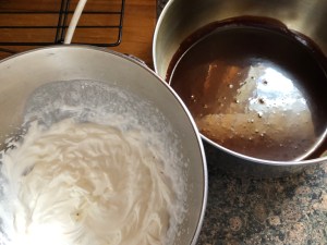 Next I made the filling. In a saucepan I combined heavy whipping cream, sugar and coffee liqueur. I cooked it over medium heat until the sugar dissolved. After removing it from the heat I stirred in semi-sweet chocolate chips with a wire whisk until they were melted. And finally I stirred in vanilla extract before transferring the mixture to a large bowl to cool for 10 minutes. Meanwhile, in a chilled medium bowl I beat additional heavy whipping cream with a hand mixer until stiff peaks formed. I then folded the heavy whipping cream into the cooled chocolate mixture.