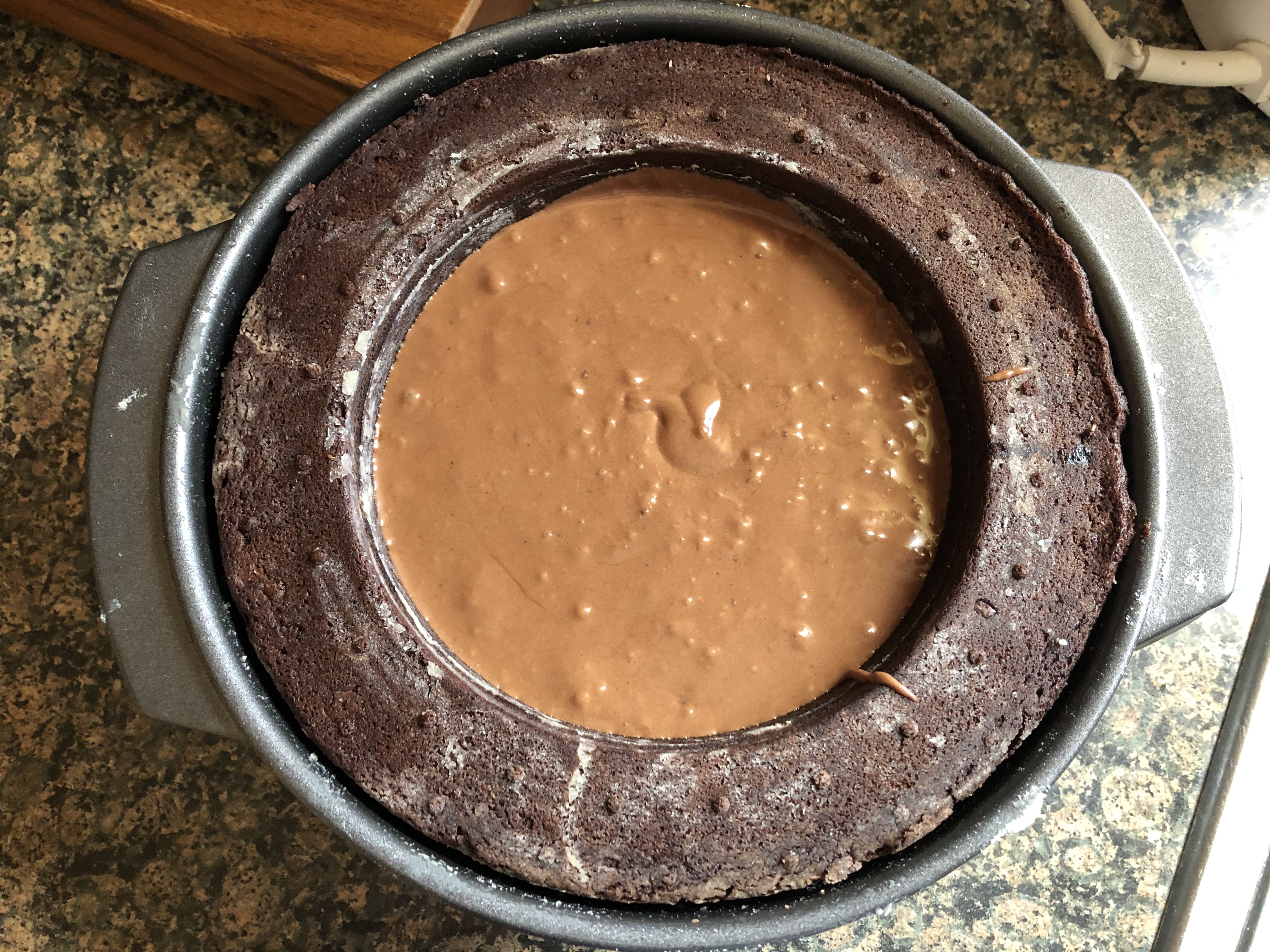I decided to follow a recipe for a Chocolate Mocha Cake with Chocolate Mousse Filling that was in the recipe book that came with the pans. I began by prepping two of the pans – the inside of the tall pan and bottom of the insert pan (this is the pan that makes the cavity in the cake so it can be filled). Normally I spray my pan with baking spray, but, I decided to follow the directions and greased them with shortening and then coated them with flour. Next, I prepped the batter. I added all of the ingredients for it into a large bowl and beat them with a hand mixer until they were blended together. I then poured it into the tall pan.