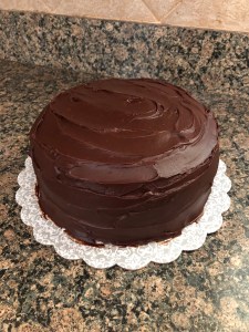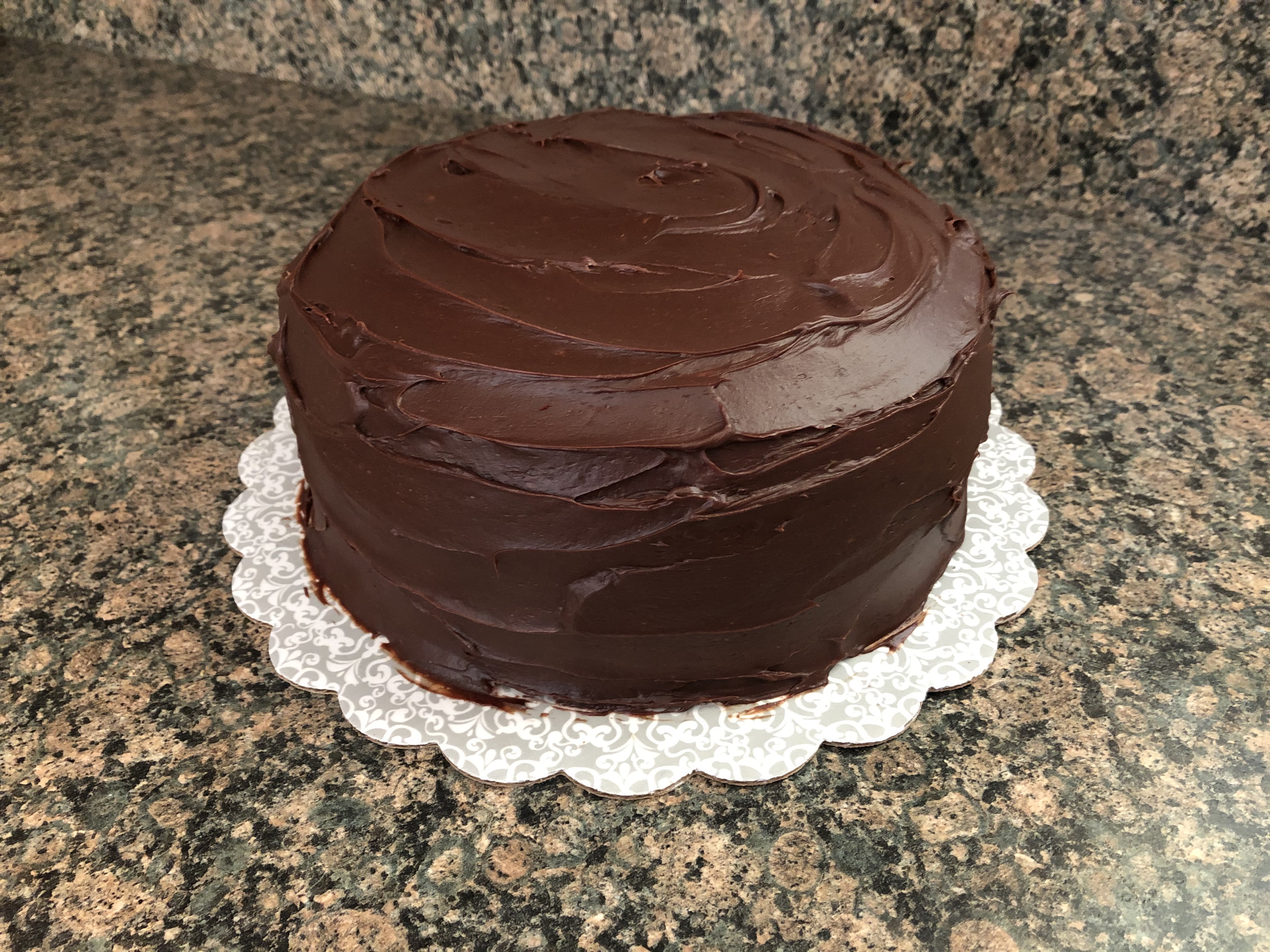 While I thought about throwing in the towel at this point I decided to go ahead and make the frosting for the cake. I added additional heavy whipping cream to a small saucepan and heated until it was hot. I then stirred in semi-sweet chocolate chips and stirred the mixture until the chocolate was melted. After letting the mixture cool for a few minutes it was the perfect consistency to frost the cake.