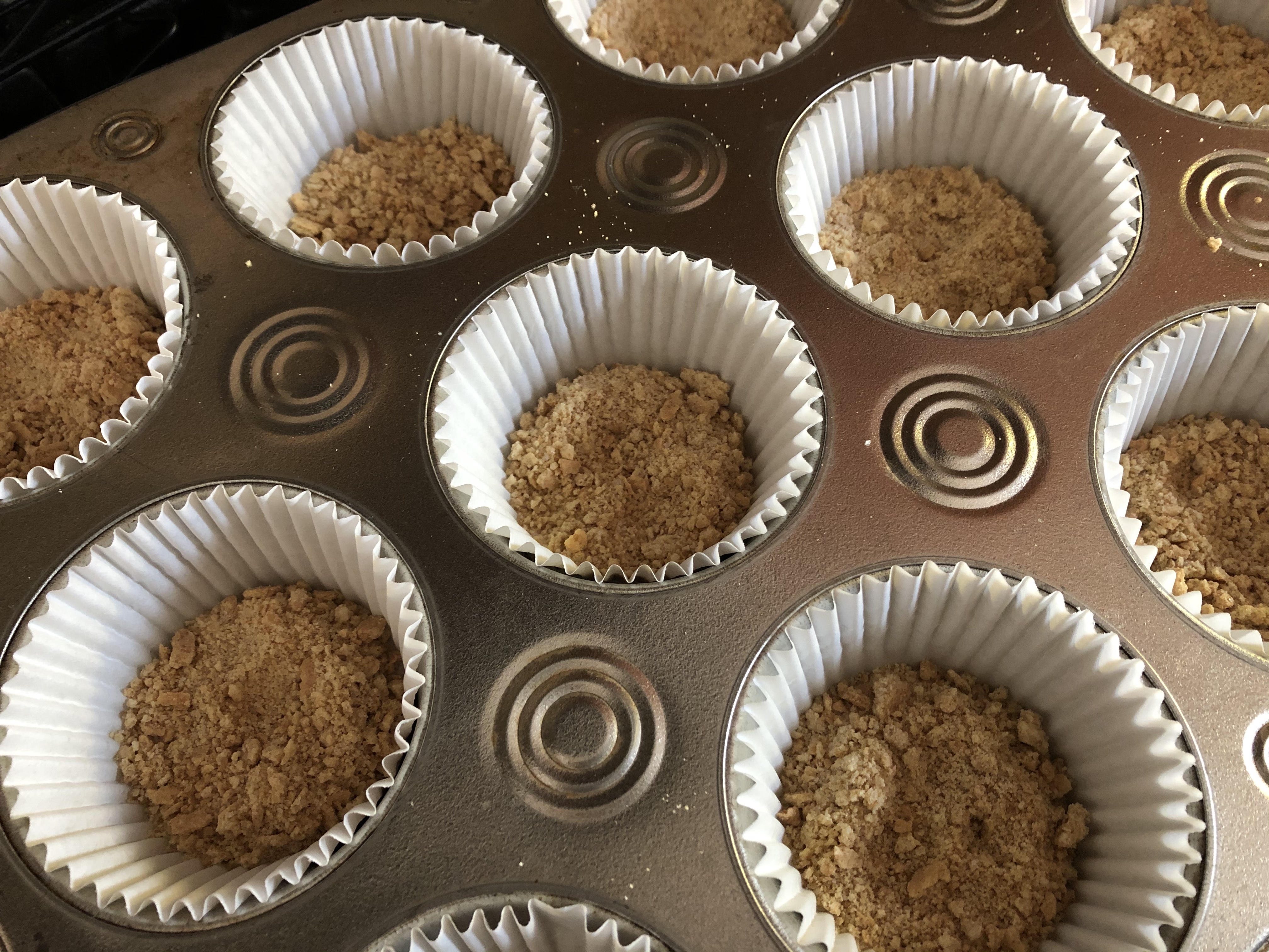 To begin I made the crust. After rolling graham crackers with a rolling pin to make crumbs, I combined them with sugar. I then placed a tablespoon of the mixture into the bottom of cupcake liners I placed in a muffin tin.