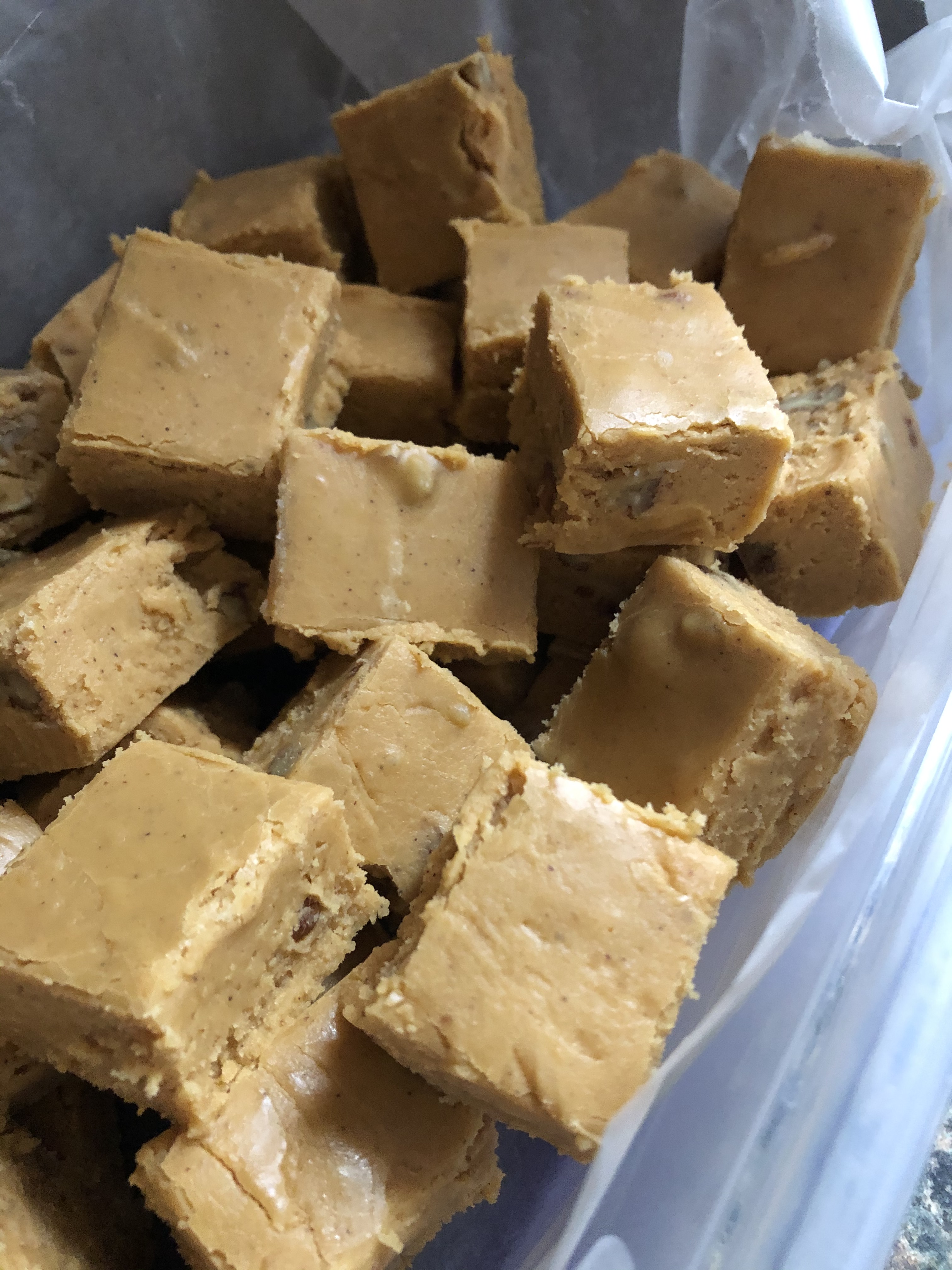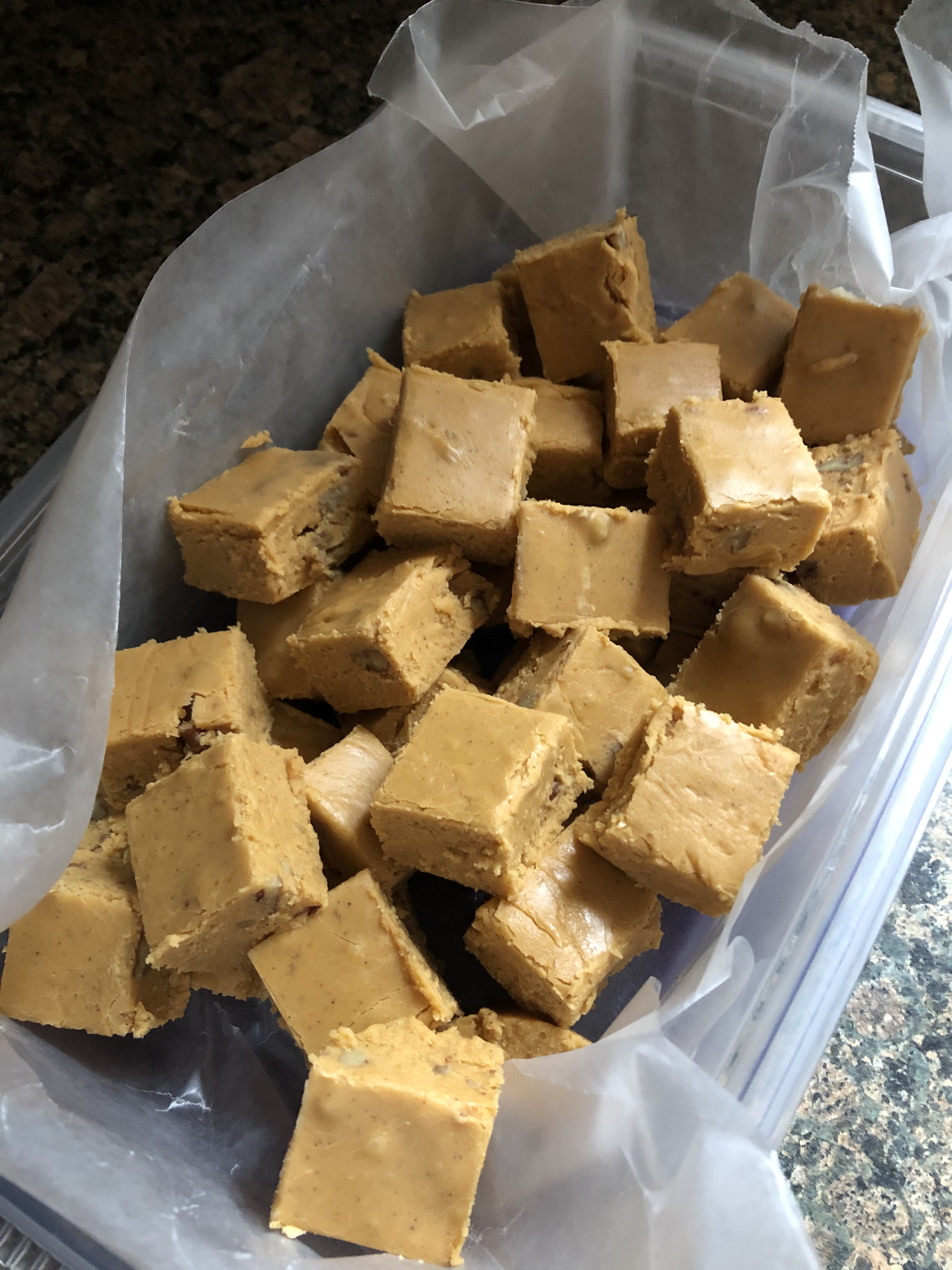 I began by lining a 9×13 baking dish with aluminum foil leaving a large enough overhang to make it easy to remove the fudge once it was done. I coasted the foil with softened butter and then got to make the fudge. In a medium saucepan I combined additional butter with sugar, evaporated milk, pumpkin puree and pumpkin pie spice and heated it over medium heat until it reached a temperature of 240 F, stirring it constantly. This took about 10 minutes. Once the mixture was at the right temperature, I removed it from the heat and stirred in butterscotch chips, marshmallow crème and vanilla extract. Once the mixture was smooth, I then stirred in chopped pecans. If you are not a fan of butterscotch chips you could swap it out for cinnamon chips. Once everything has been well incorporated, I poured it into my prepared pan and let it sit overnight so it could cool and set.