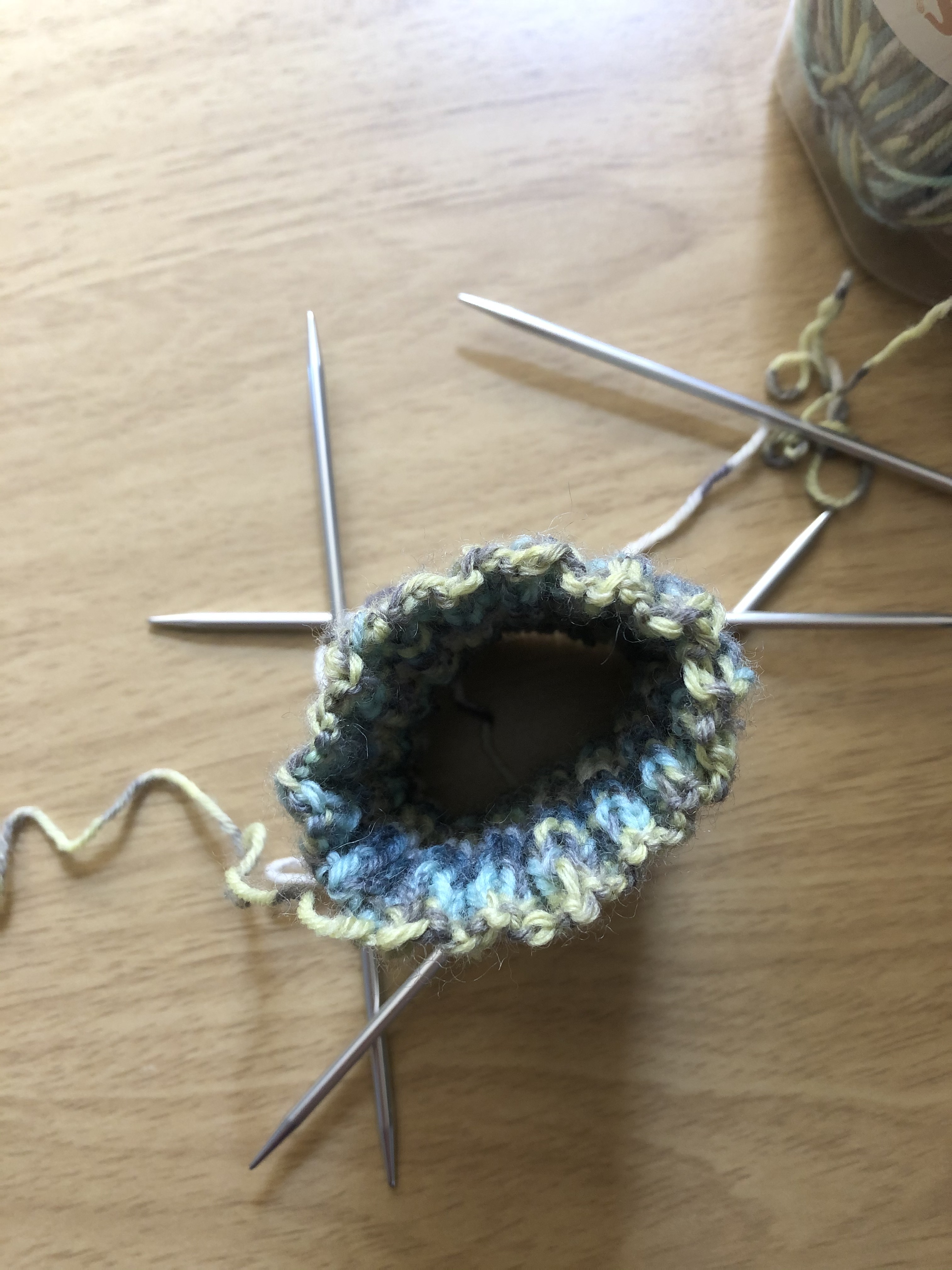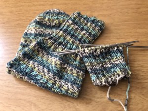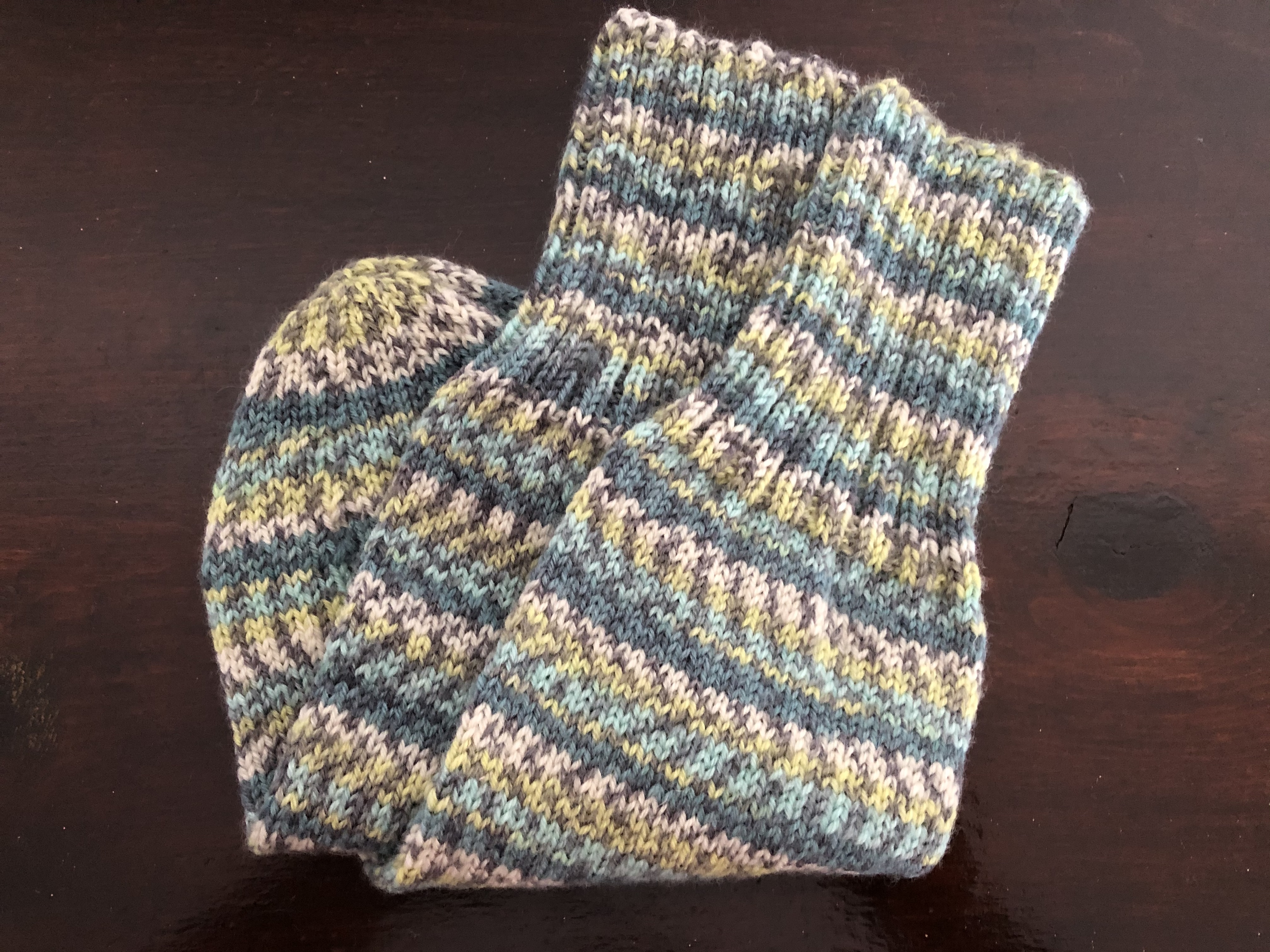 Before the pandemic started and everything shut down, I was taking crocheting/knitting classes at my local library to learn new patterns and get together with other yarn crafters. Before the pandemic ended the classes I learned how to make crocheted market bags and had just started a class to make a Knitted Keyhole Scarf. What I was excited about though was that I was finally going to learn how to knit socks. It’s something I have been wanting to learn for a while but whenever I read the patterns, they made absolutely no sense to me. I had unfortunately missed the class to learn how to make socks, but the teacher was willing to show me during one of the classes and gave me a pretty easy pattern to follow. A tube sock pattern that didn’t require me to knit a heel, which apparently is the hardest part of making socks. So, I bought the knitting needles I would need (size 3 9-inch circular) and already had the yarn and then classes ended, but I was still determined to learn how to make them.