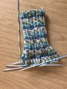 Thanks to YouTube, I was able to figure out how to start the socks. Using the short-cabled knitting needles I casted on 64 stitches and then divided those stitches among three double-pointed knitting needles. I then worked in a K2, P2 ribbed pattern for five inches to make the cuff of the socks.