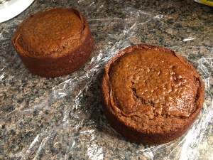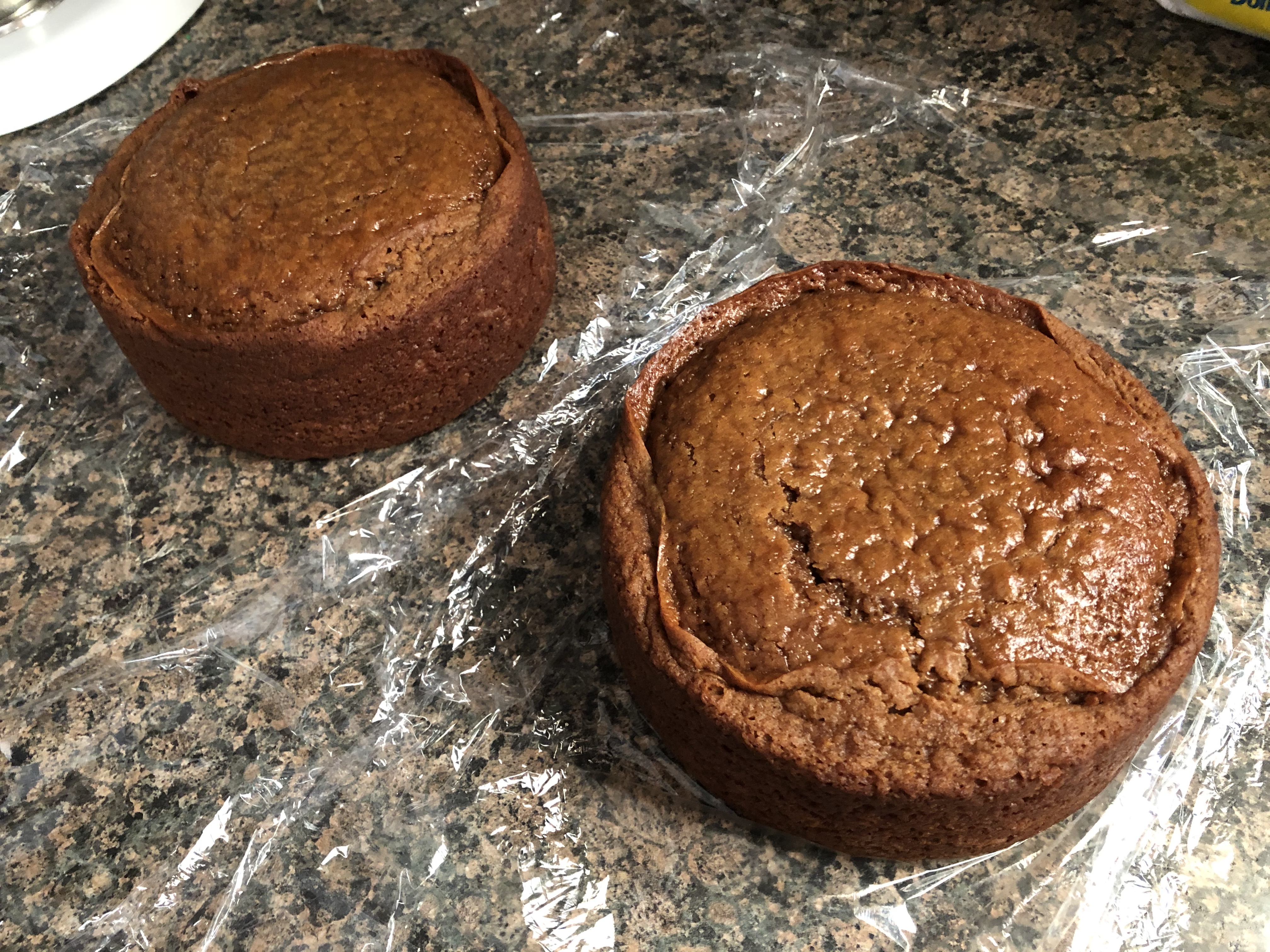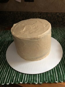 To make things a little easy I used a spice cake mix as the base for my cake and then added in some additional spices, molasses and other ingredients to doctor it up. I got the recipe from fellow blogger Baking with Blondie. She made cupcakes with her recipe whereas I opted to use the recipe to make 2 6-inch cake layers. Once they were cooled, I wrapped them in plastic wrap and refrigerated them overnight before frosting. Frosting cold cakes is a lot easier than frosting cooled, but still room temperature ones.