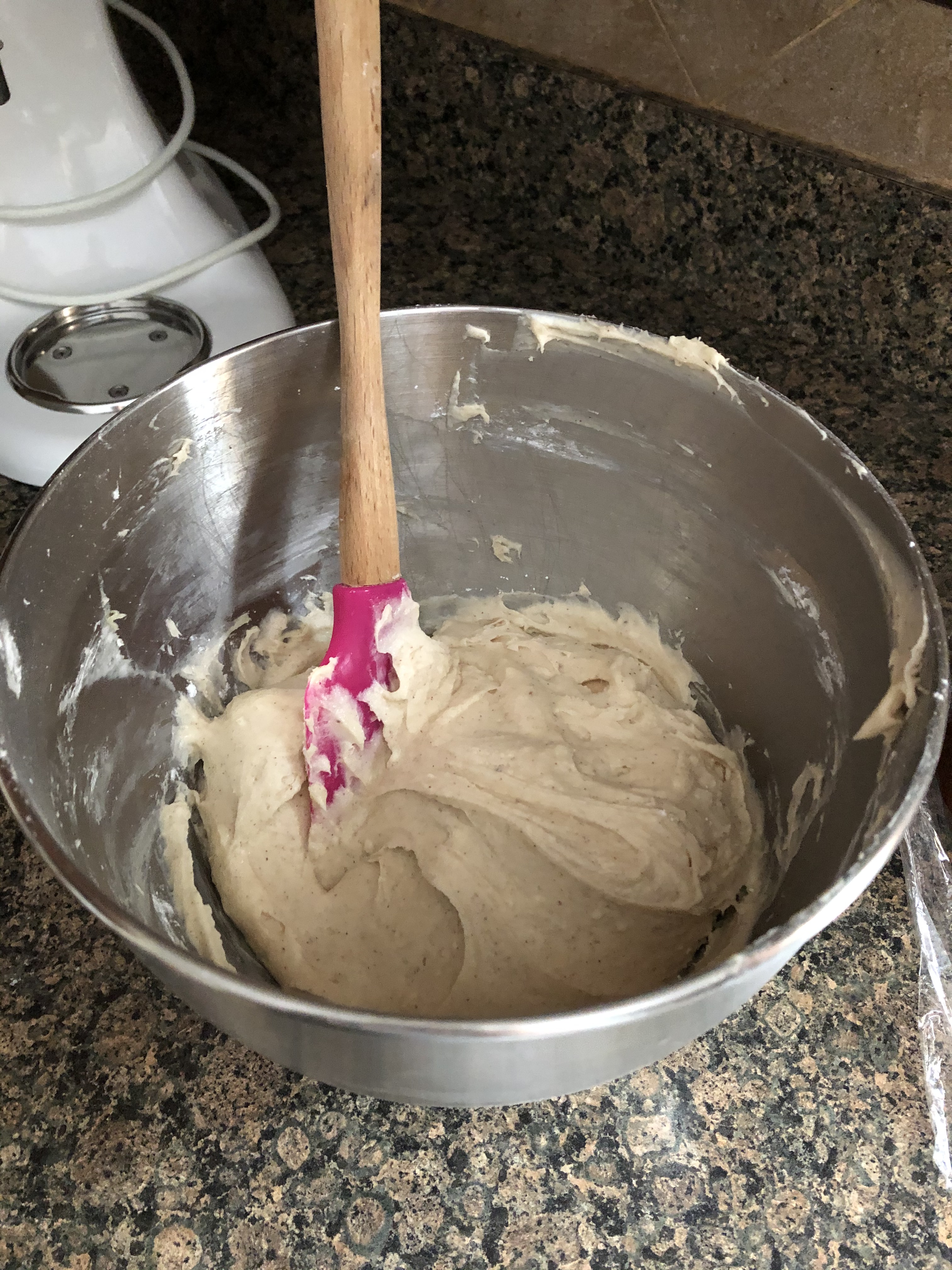 I left the cakes in the refrigerator overnight and before removing them I made a Spiced Almond Cream Cheese Frosting. This frosting is so good I could eat spoonful’s as dessert!