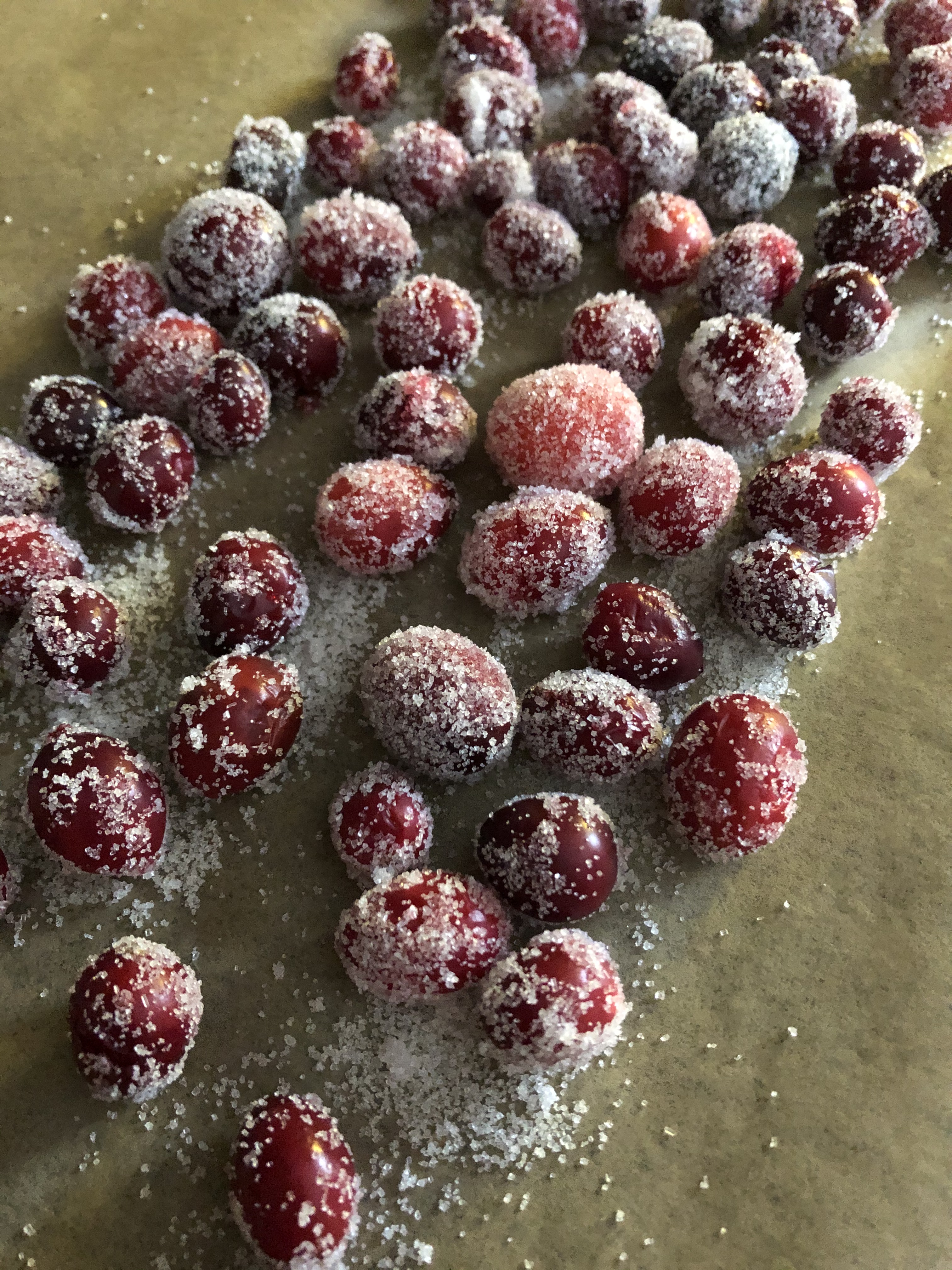 Pour the remaining sugar into a bowl. Once the cranberries are dry work in batches to coat the cranberries in the sugar. Transfer to a clean piece of parchment paper and let the cranberries dry for at least an hour.