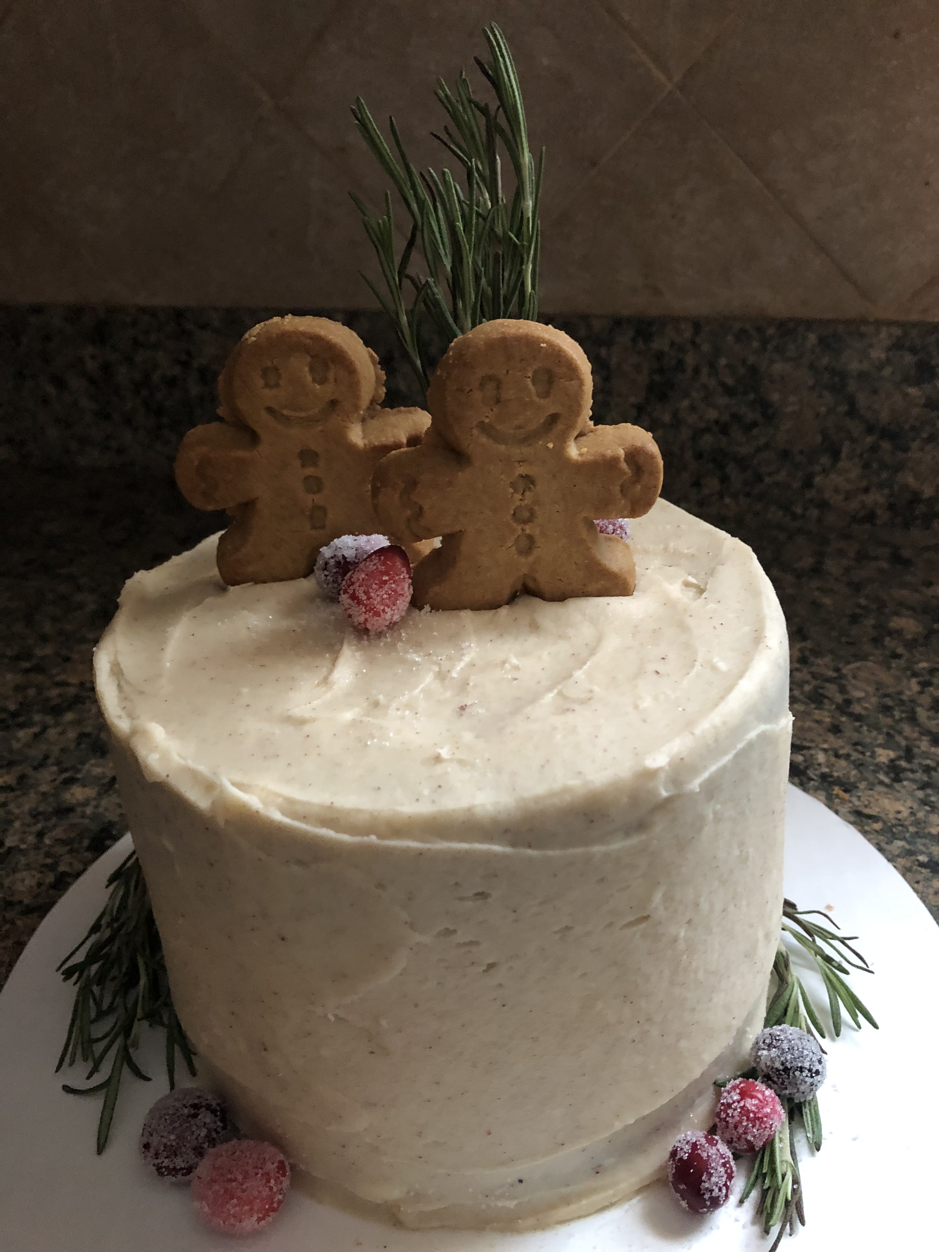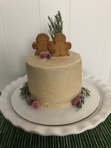 Torte the cooled cakes and then frost about a cup of the frosting on one of the cakes. Stack the other cake on top and crumb coat the cake. Refrigerate for about 15 minutes and then use the remaining frosting to finish frosting the cake. Decorate with gingerbread men, sugared cranberries and fresh rosemary.
