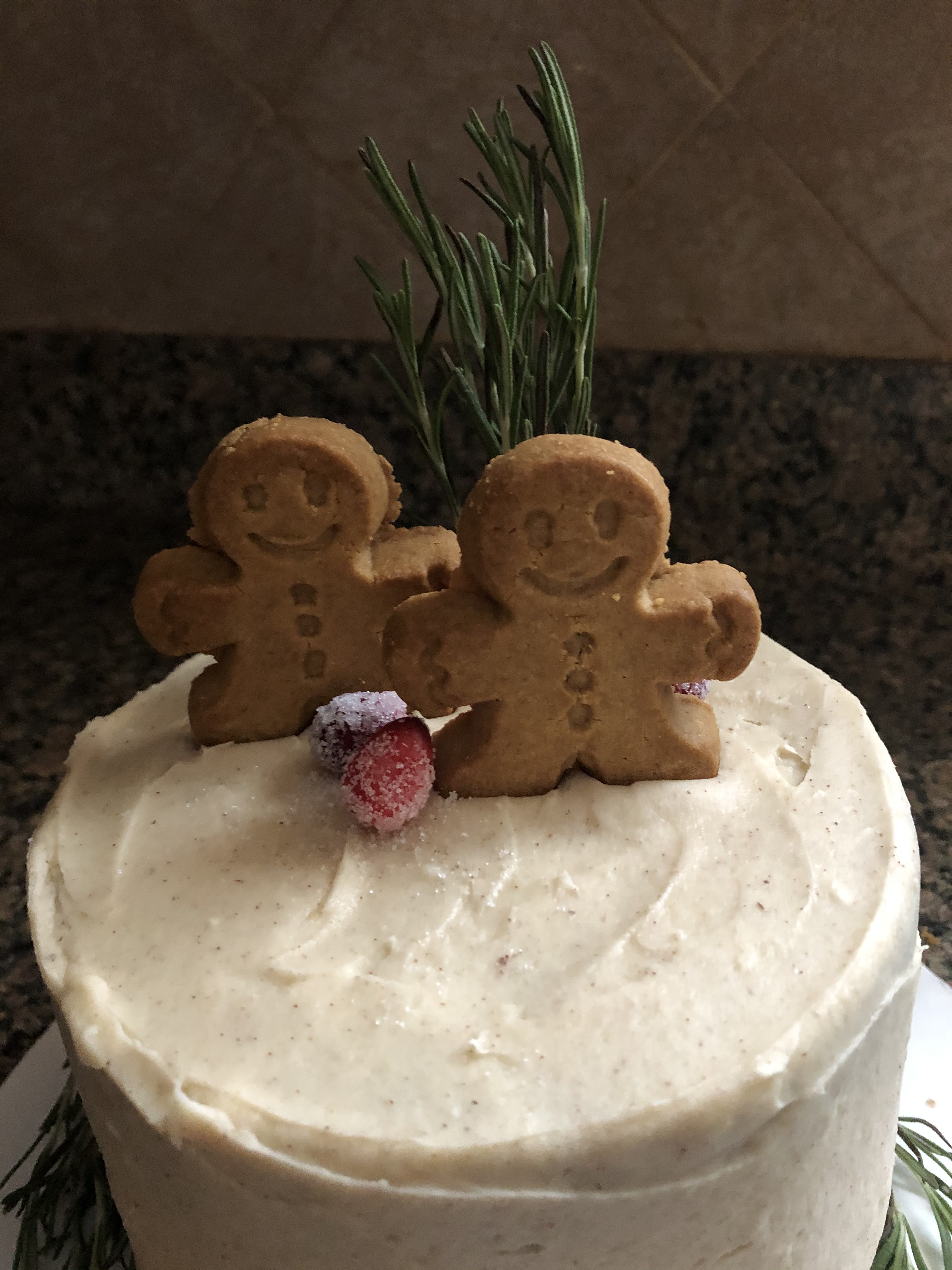 And finally, I decorated the cake with gingerbread men (you could bake them or, do as I did and use store-bought ones), fresh rosemary and sugared cranberries.