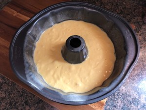 In a large bowl combine the ingredients for the cake and using a handheld mixer beat on medium speed until smooth. Transfer to the Bundt pan and bake the preheated oven for 50 – 60 minutes, or until a cake tester inserted in the center comes out clean.