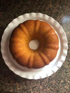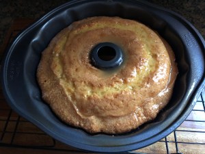 Wait until the cake is done to make the glaze. In a medium saucepan combine the ingredients for the glaze – butter, sugar & rum – and cook over medium heat until the mixture begins to boil. Once the mixture begins to boil it’s ready. Use a butter knife to loosen the sides of the cake from the pan. Pour the hot mixture over the cake and along the sides of the cake.