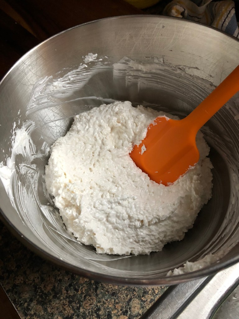 Next up, the macaroon layer. Using my stand mixer with the whisk attachment, I beat egg whites until they were frothy and then slowly added in sugar, vanilla extract and salt until stiff peaks formed. Finally, I added in shredded coconut and my macaroon layer was ready.