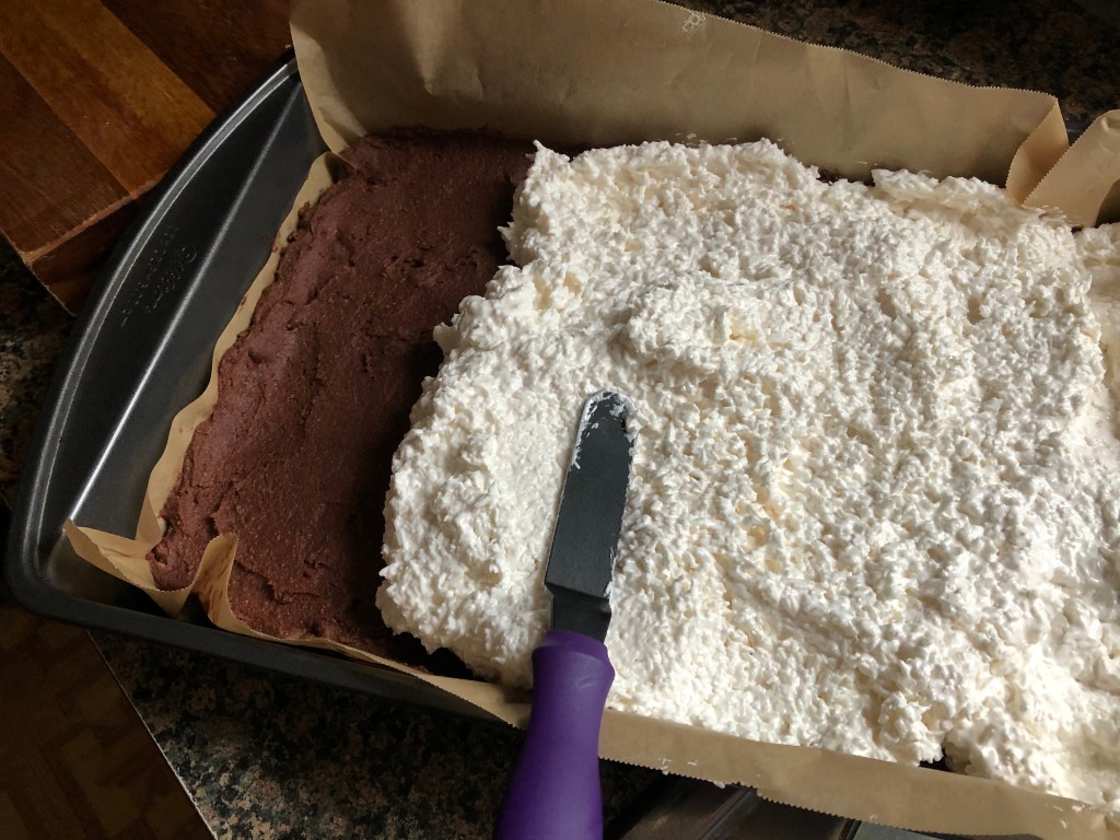 Using a small offset spatula, I spread the coconut mixture over the brownie base.