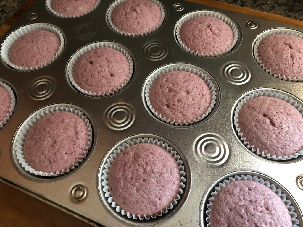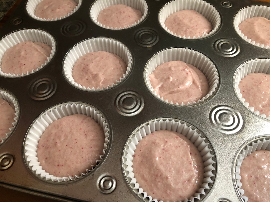 Once the raspberry powder and puree was ready, I incorporated the puree into my wet ingredients and the powder into my dry ingredients and then mixed the dry ingredients into the wet ingredients alternating with milk. When filling my cupcake liners, I erred on the side of caution when filling them since I wasn’t sure how much they would rise. As you can see, I filled them about 3/4 quarters of the way…