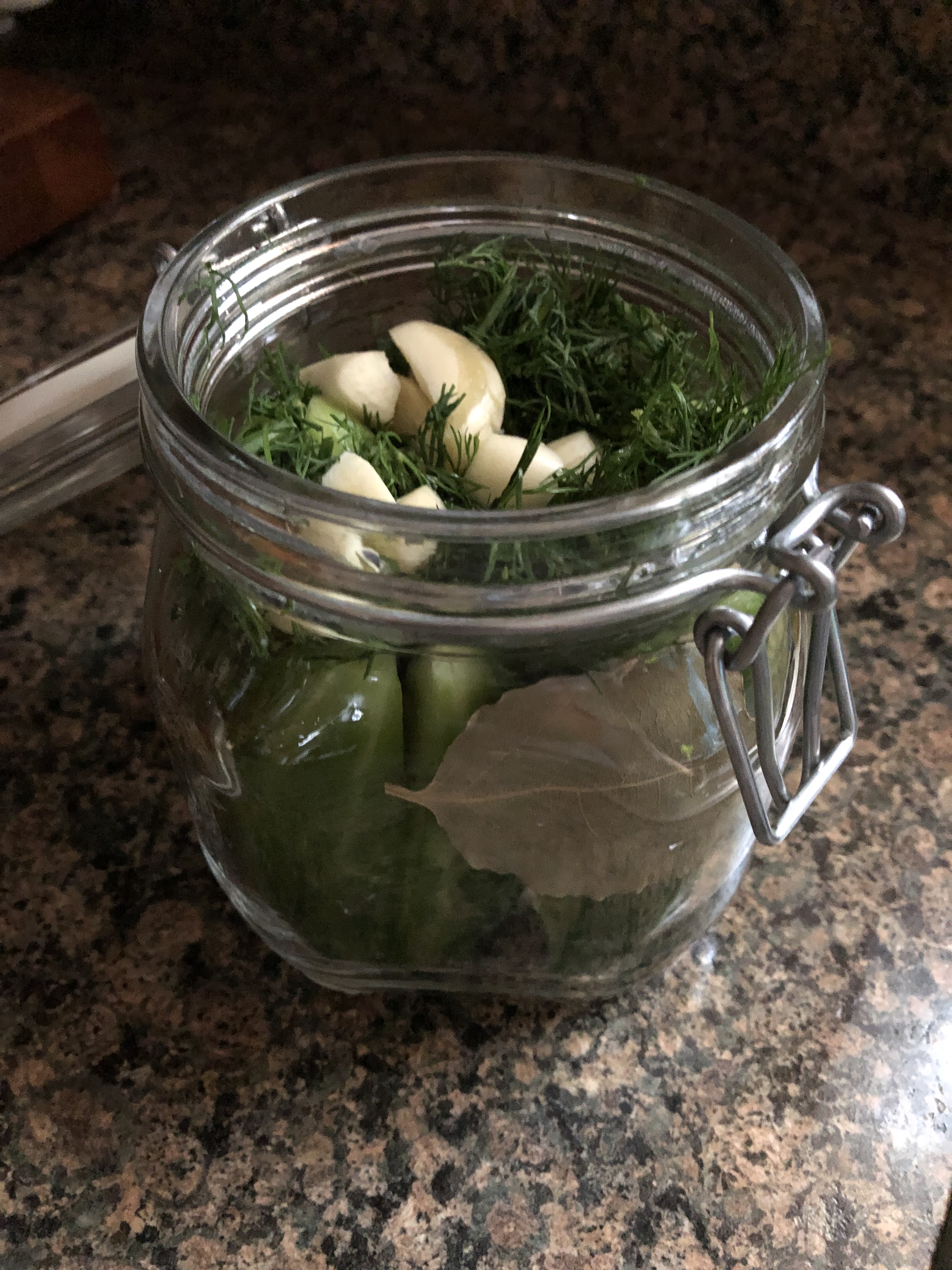 Top the cucumbers with the dill and garlic and place the bay leaf on the inside of the jar. Pour the water mixture into the jar until the cucumbers are fully submerged. Seal the jar and refrigerate at least 24 hours before enjoying.