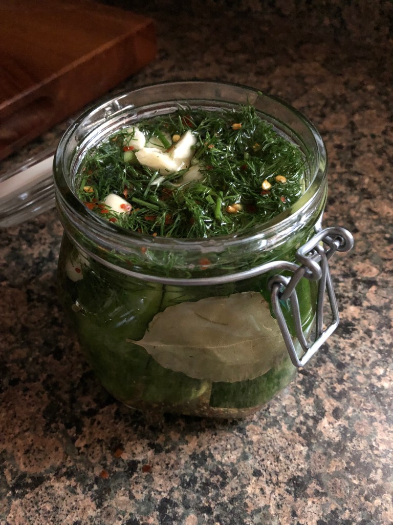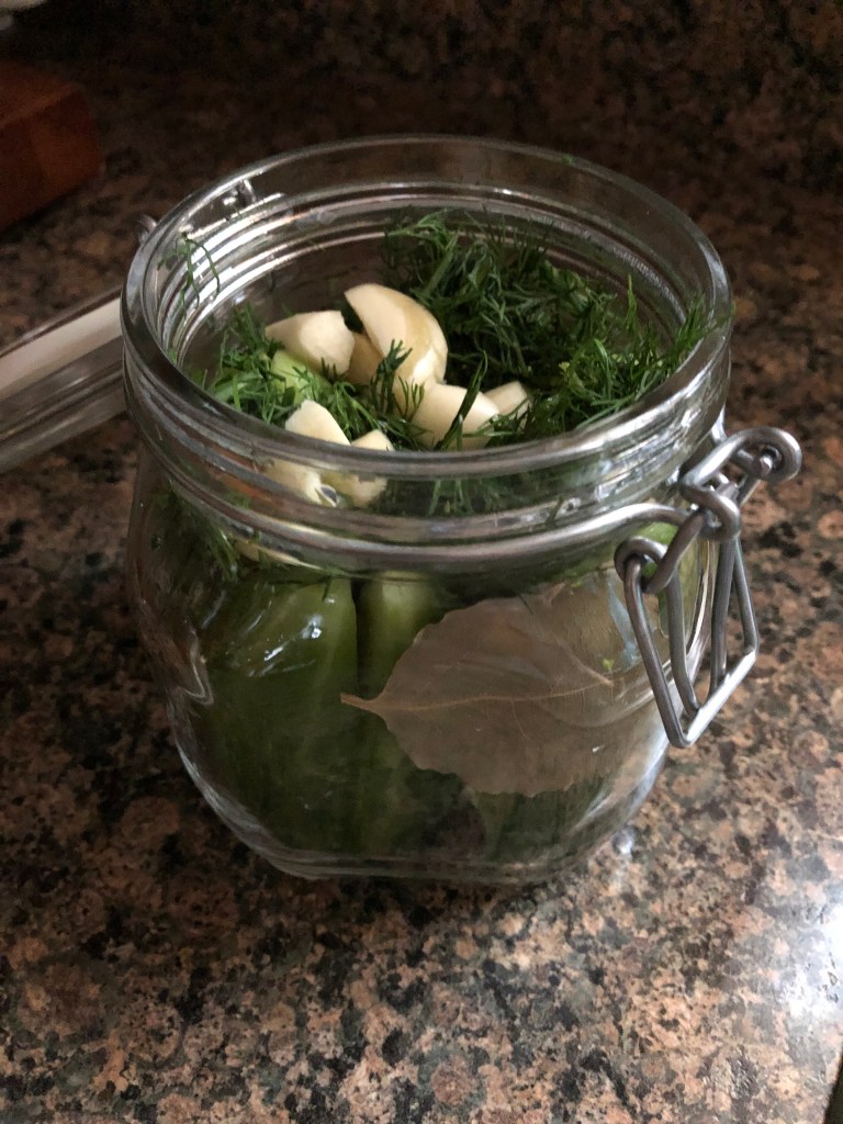 To begin, I sliced two cucumbers into spears. I first sliced each of the cucumbers in half and then sliced those halves into halves or thirds depending on the size of the cucumbers. Next, I placed the cucumbers into a 32oz. wide mouth jar. I topped the cucumbers with chopped dill and smashed garlic cloves and tucked a bay leaf on the inside of the jar.