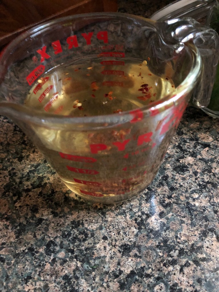 In a liquid measuring cup I combined water, rice wine vinegar, sugar, salt, red pepper flakes and black pepper and stirred everything together until the salt dissolved. I sampled the mixture to ensure that it had the right about of sweetness and spiciness.