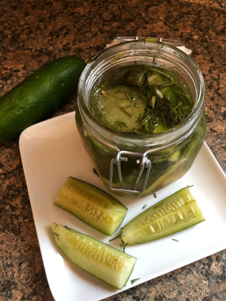 Pickles, you either love them or hate them. It’s one of those food items that there doesn’t seem to be an in between about. I am on the “love them” side of the fence so when my cucumber plant started producing more cucumbers that I could possibly eat or give away I decided to turn them into one of my favorite snacks.