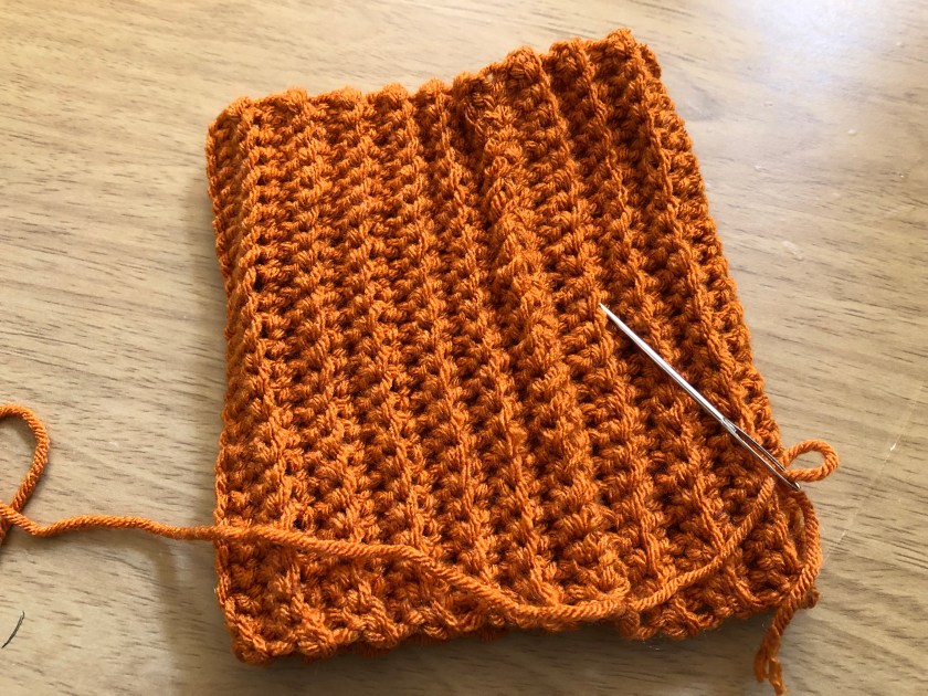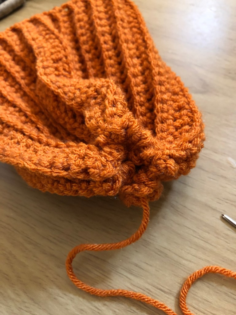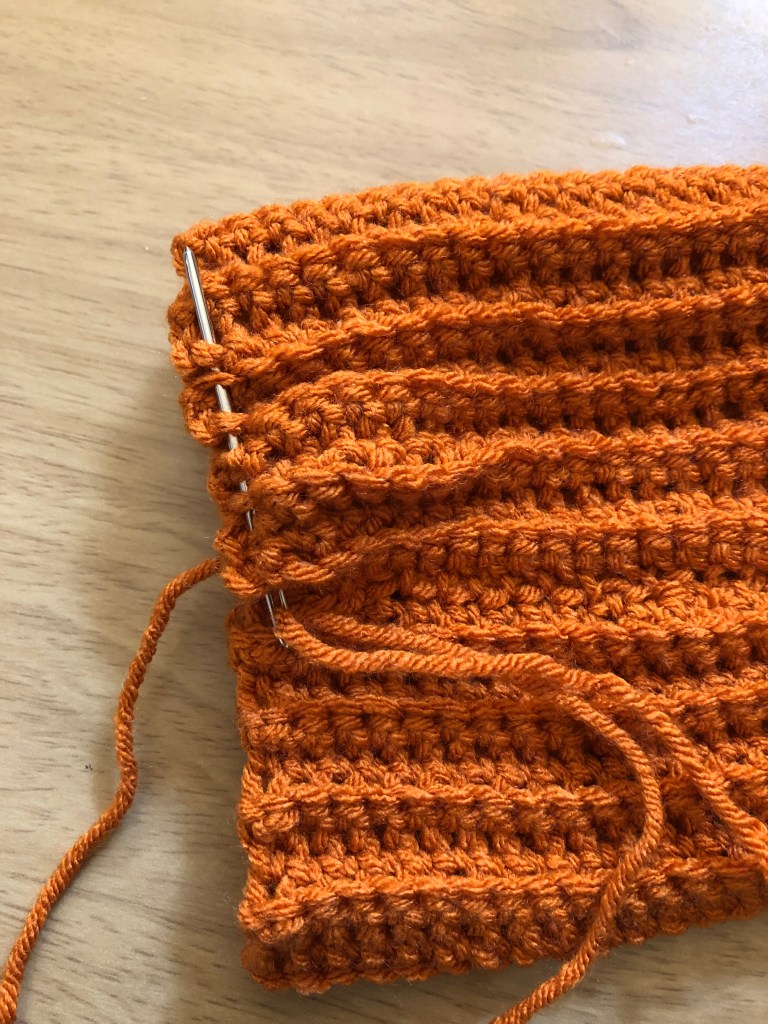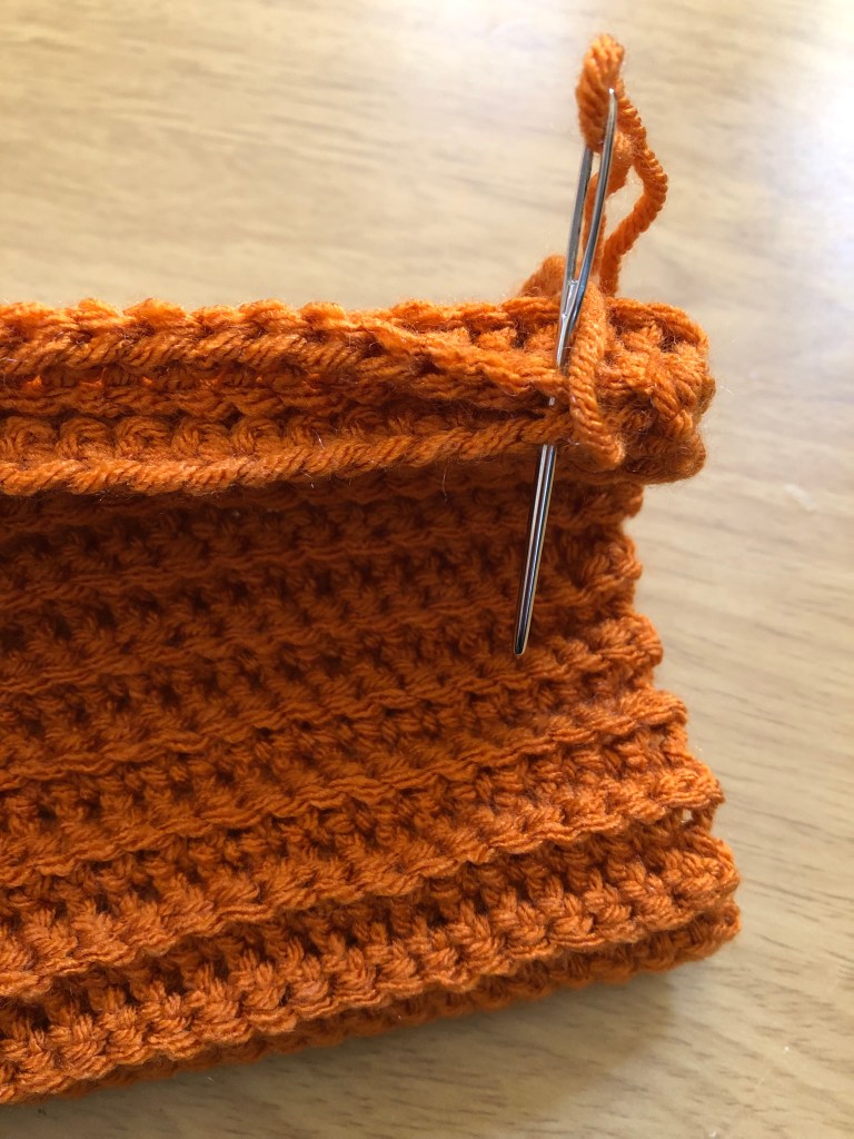 Now that you have your rectangle it’s time to make your pumpkin. Fold the rectangle in half with the short ends meeting, and thread a needle on the tail from your foundation chain. Or, the shorter of the two tails. And just seam up the two sides. Make sure as you are seaming the edges that they are meeting up at the corner you are working towards. Once you are done, weave the tail through the work and end it. Since you want to hide this seam, you want to turn your project inside out for the finishing steps.