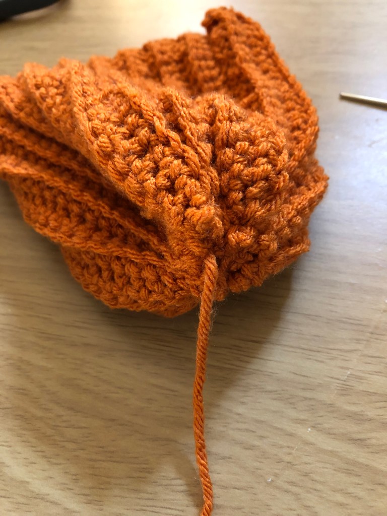 I read over some other patterns and watched a video or two and figured out the best way was to crochet a rectangle and then form that into a pumpkin.