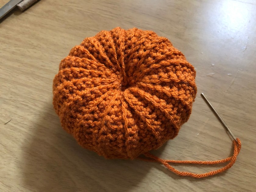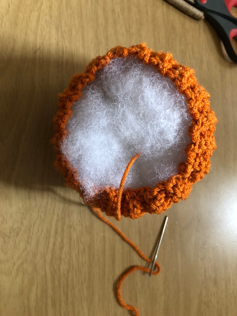 Stitch the top of the pumpkin in the same manner as you did the bottom to close it.