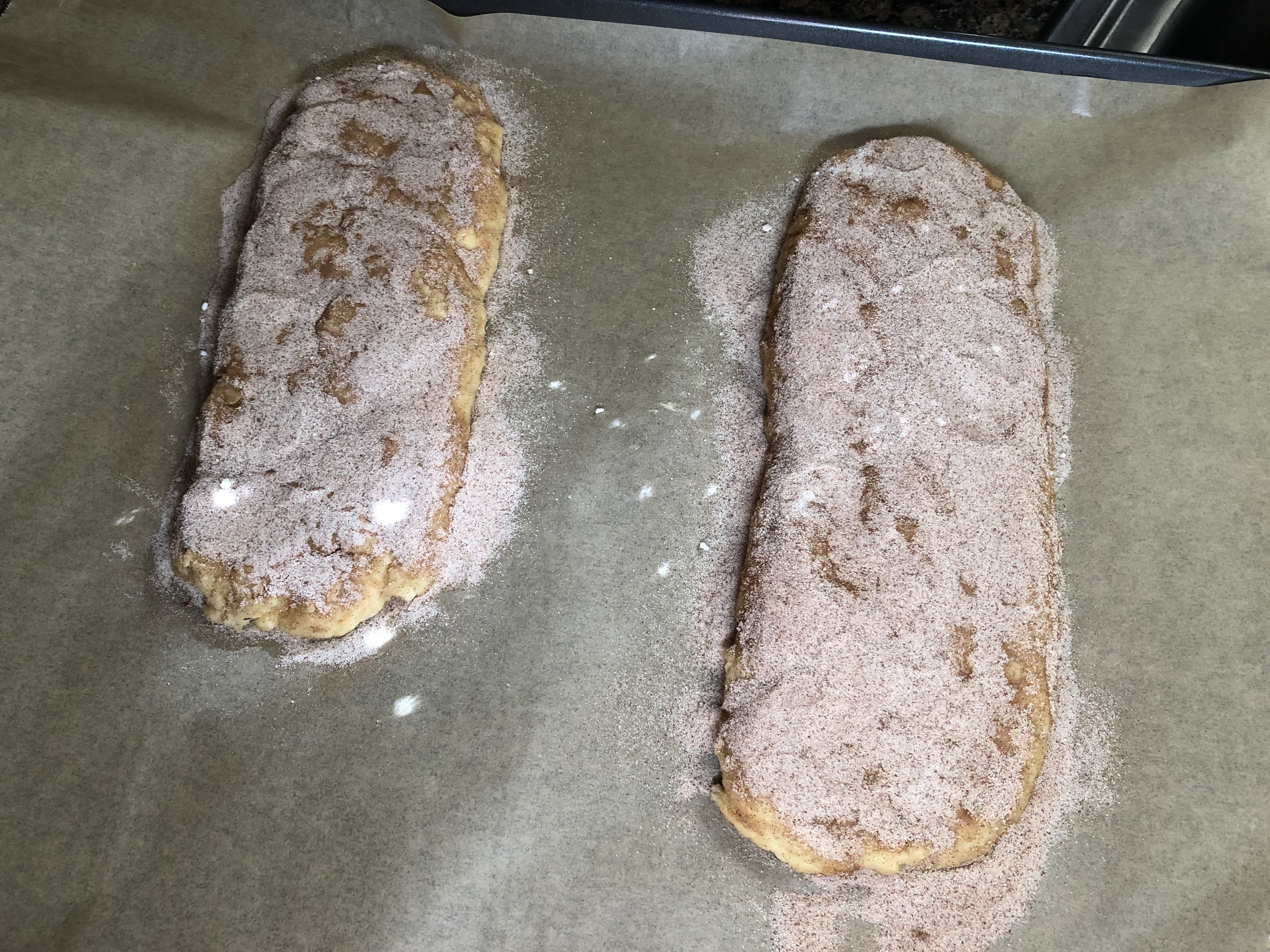 Once the dough was chilled I divided it in half and shaped both pieces into a 10×4-inch rectangle. The dough was quite sticky so I wet my hands with water beforehand. I would suggest shaping the dough right on the parchment paper. You may have trouble transferring it from your counter to the baking sheet otherwise. Next, I generously covered both loaves with a cinnamon-sugar mixture and gently pressed it into the dough.