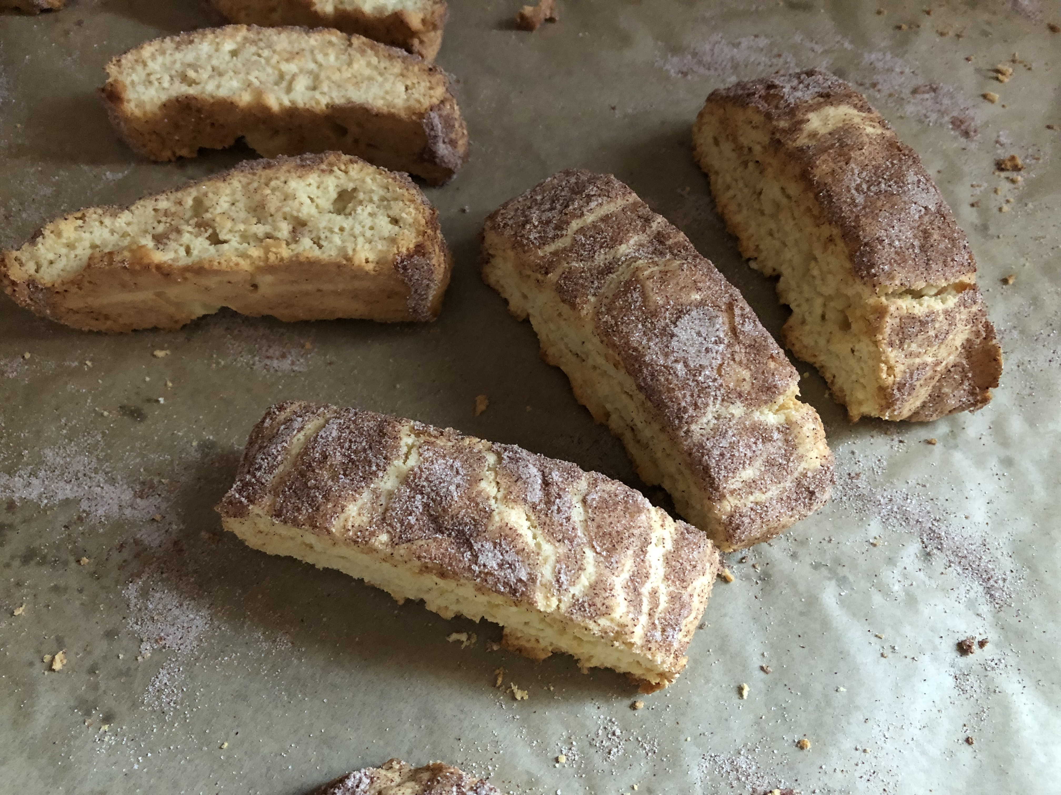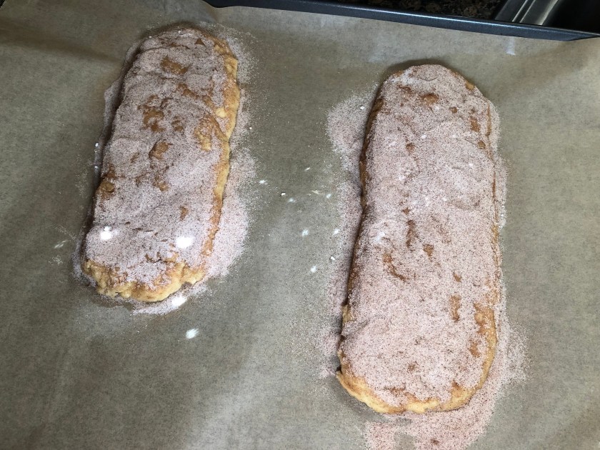 One thing I should note, the original recipe called for dipping the finished biscotti in white chocolate. I opted to omit that part since a) Snickerdoodles aren’t normally dipped in chocolate and b) I like to dip my biscotti in tea or hot cocoa and I felt that the white chocolate would just get in the way of that.