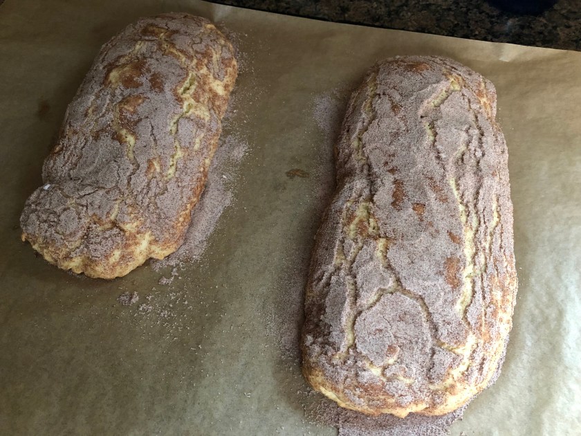 After baking in a 350 F oven for 25 minutes I removed it and using the parchment paper I transferred it to a wire rack to cool for 10 minutes. While the loaves cooled I lined my baking sheet with a fresh piece of parchment paper. I must say, the top of the loaves reminded me of what snickerdoodles look like after they are baked. That cracked look with the cinnamon-sugar coating.