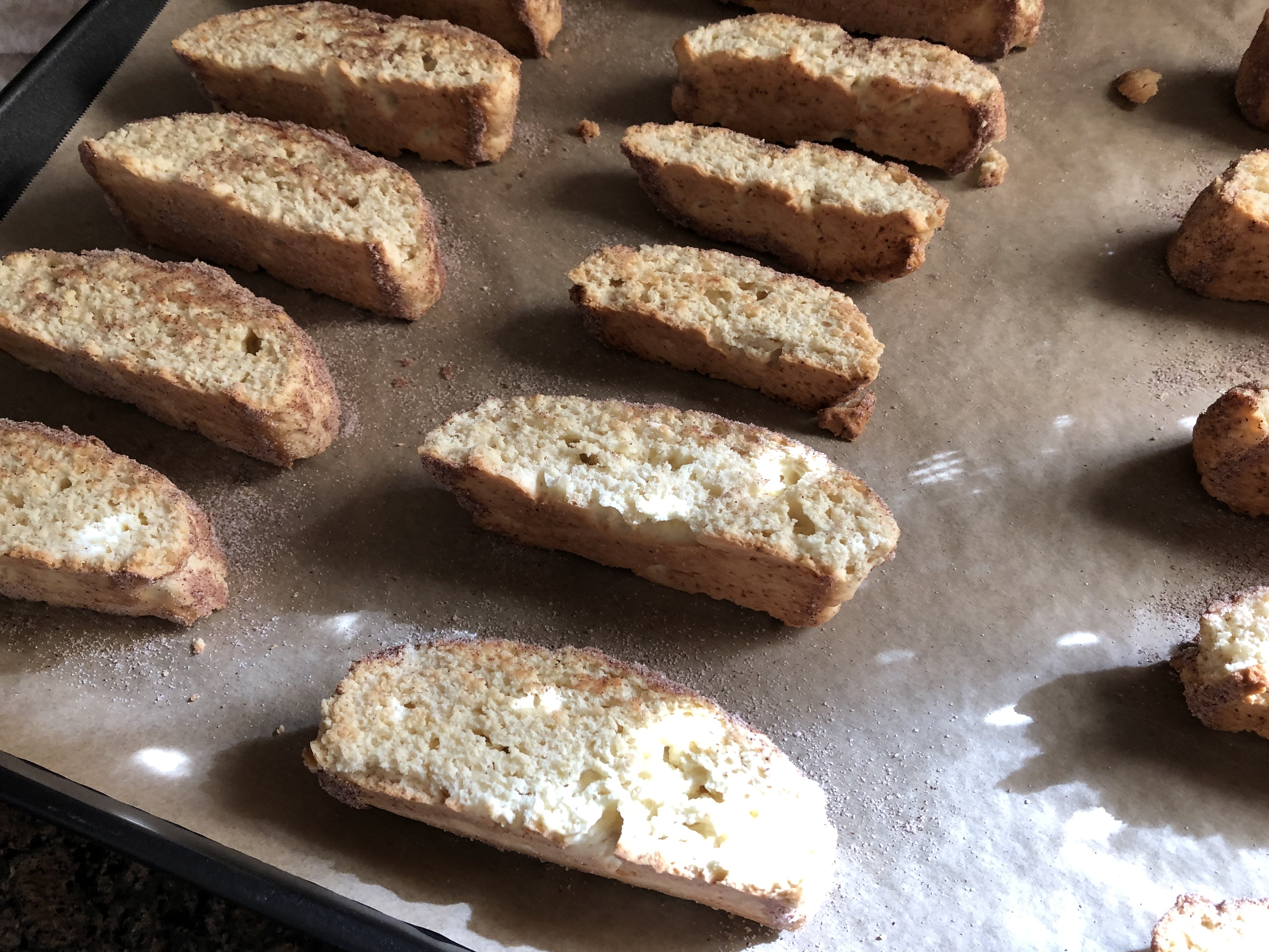 After letting the loaves cool for 10 minutes I used a serrated knife to slice them into 3/4-inch pieces. I then placed the biscotti, cut side down, back on my prepared baking sheet. I baked them for 10 minutes, flipped them, and then baked them for an additional 10 minutes. I then let the biscotti cool completely on the pans before enjoying.