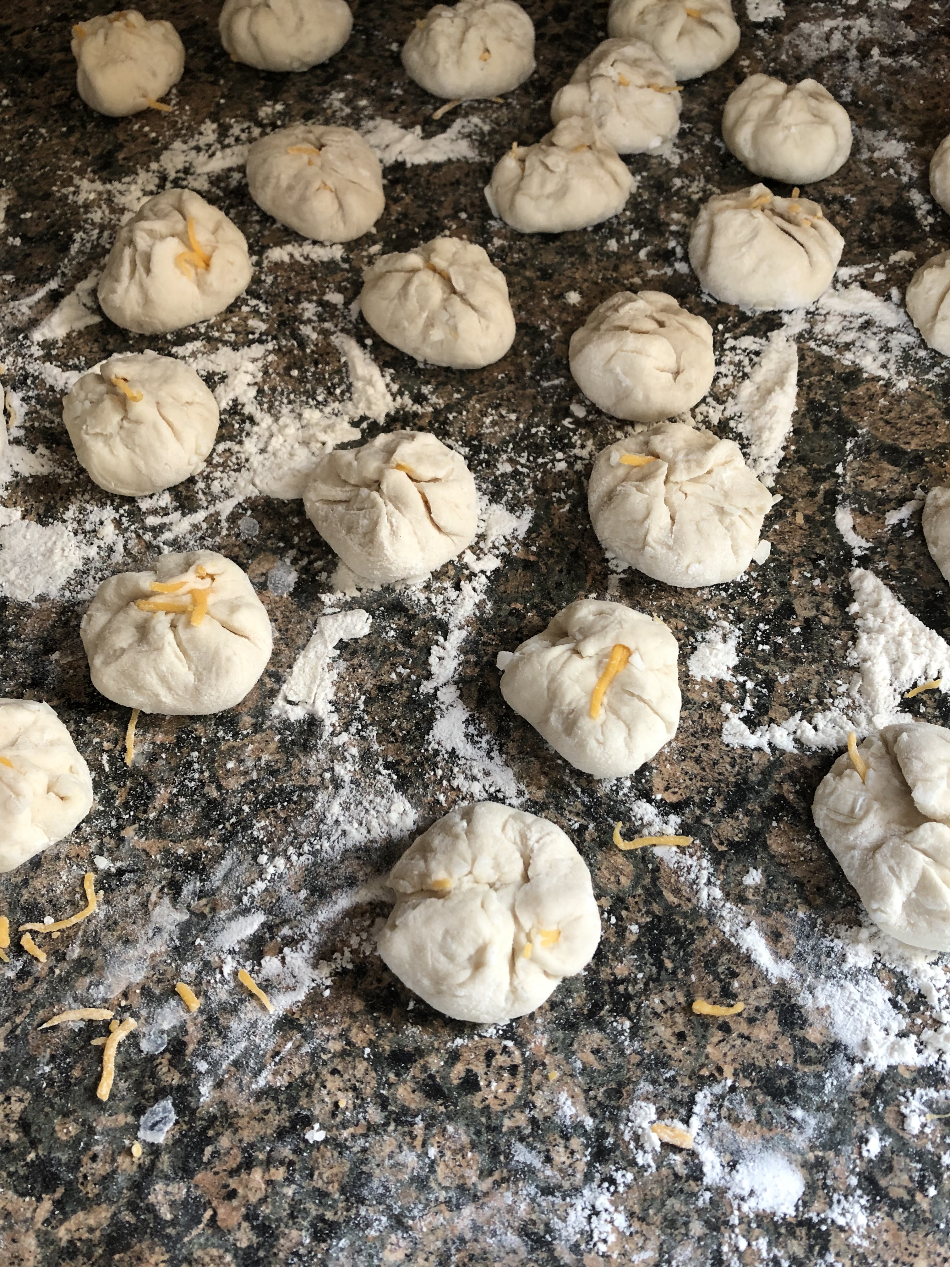 Next, I placed about a teaspoon of shredded cheddar cheese in the center of each dough piece and pinched it closed.