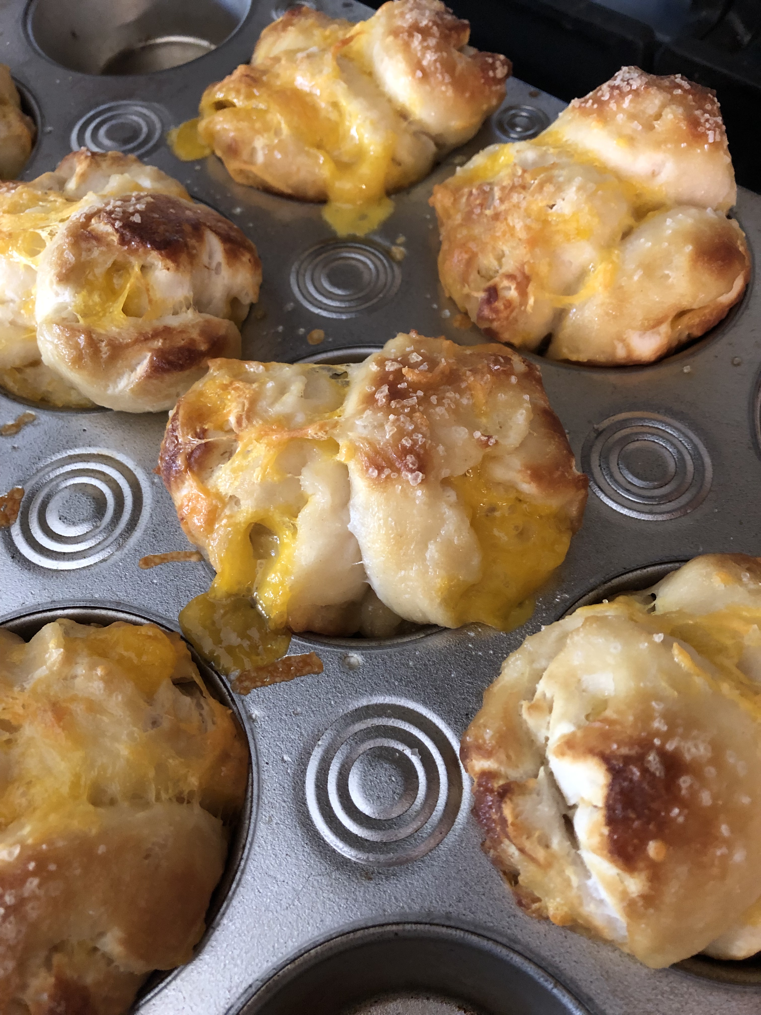 Next, I sprayed 8 cups of a 12-cup cupcake tin with baking spray and placed three dough balls in each. I then sprinkled each with an additional teaspoon of shredded cheddar cheese and topped each with the remaining dough balls.