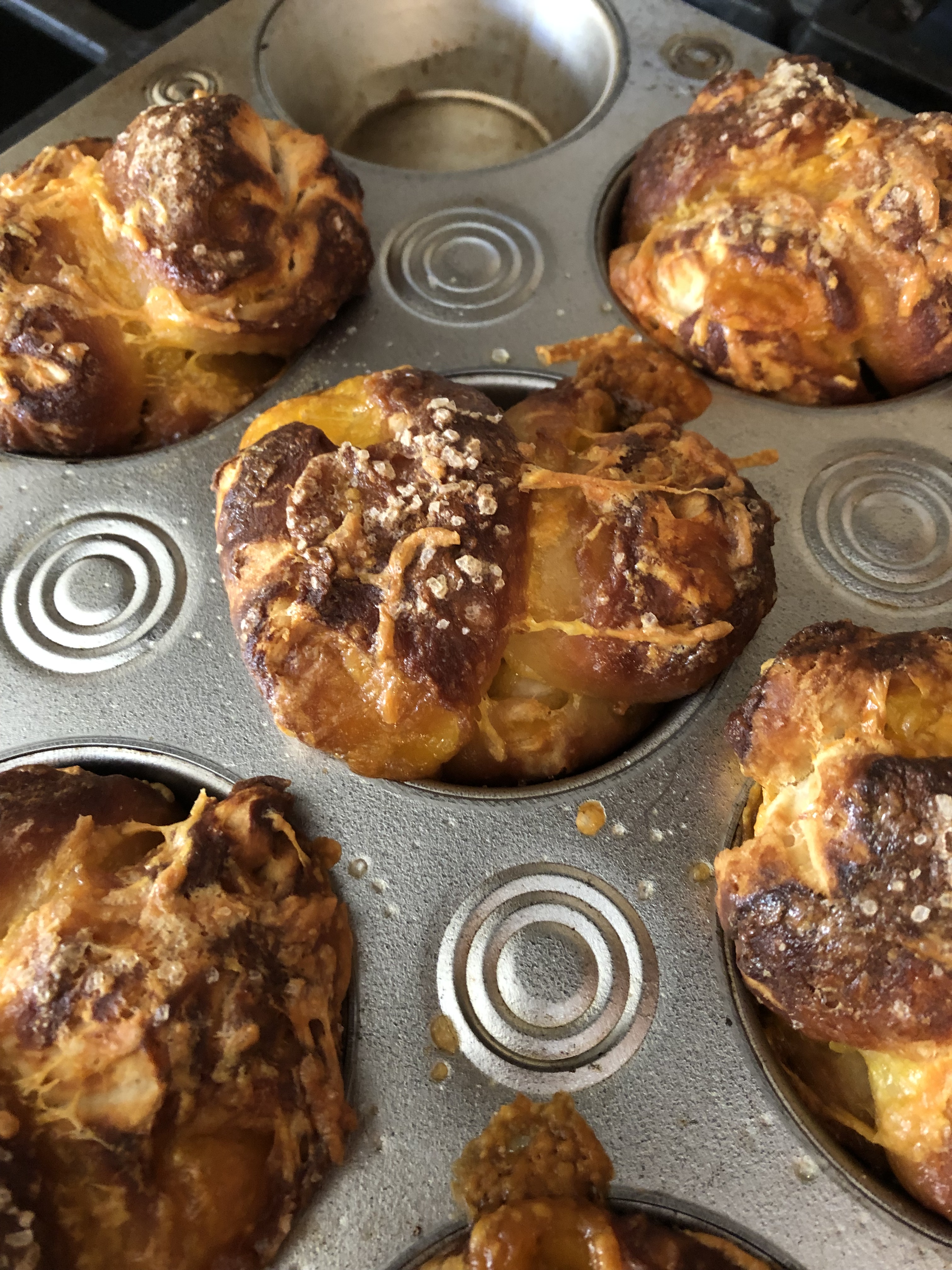 I always come across recipes for pretzels that sound amazing and I am tempted to make them, but it never happens. I attempted to make pretzels from scratch once years ago (before I even started blogging) and I must have been scarred by the experience because since then I haven’t tried again. Those pretzels were a complete fail so subconsciously I must be holding on to that. Recently though while scrolling through Instagram I came across a video from Food Network that used refrigerated biscuit dough to make Pretzel Monkey Muffins and I knew I had to try them.