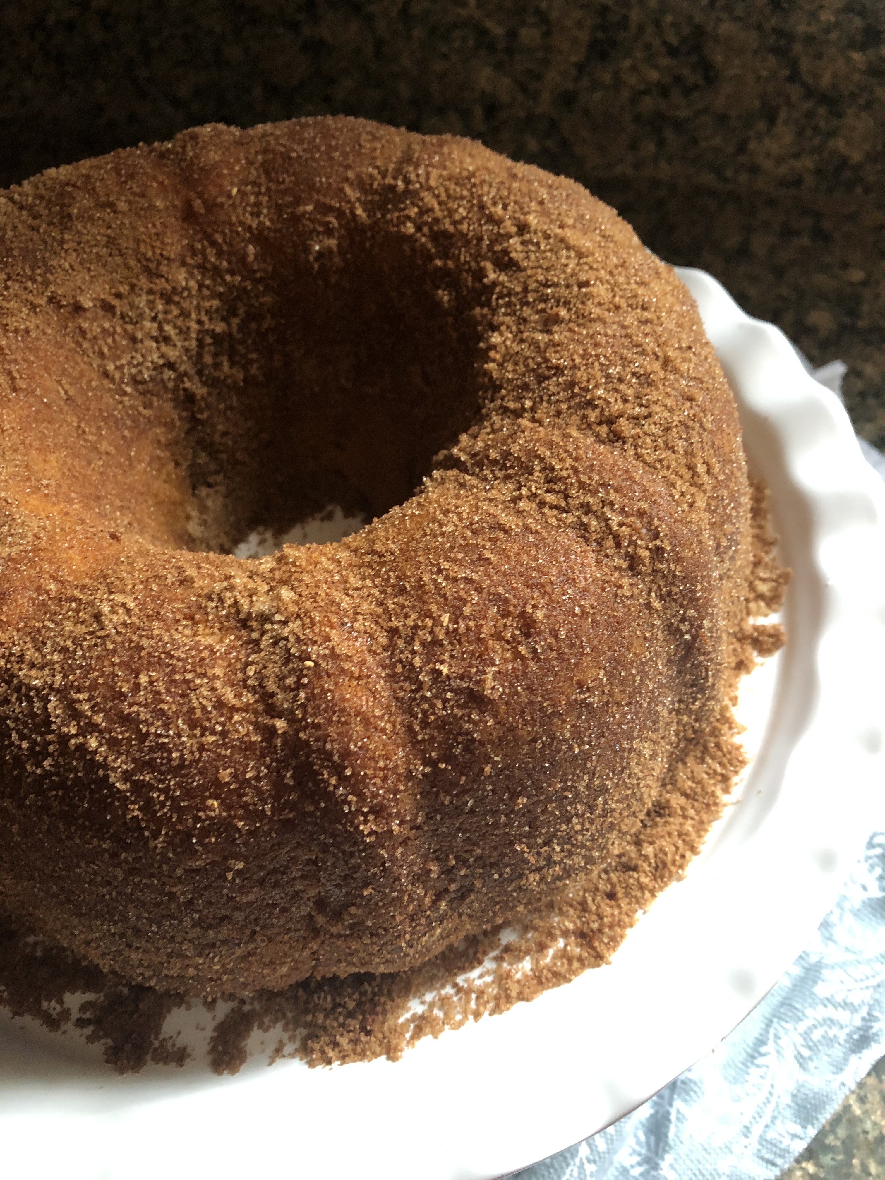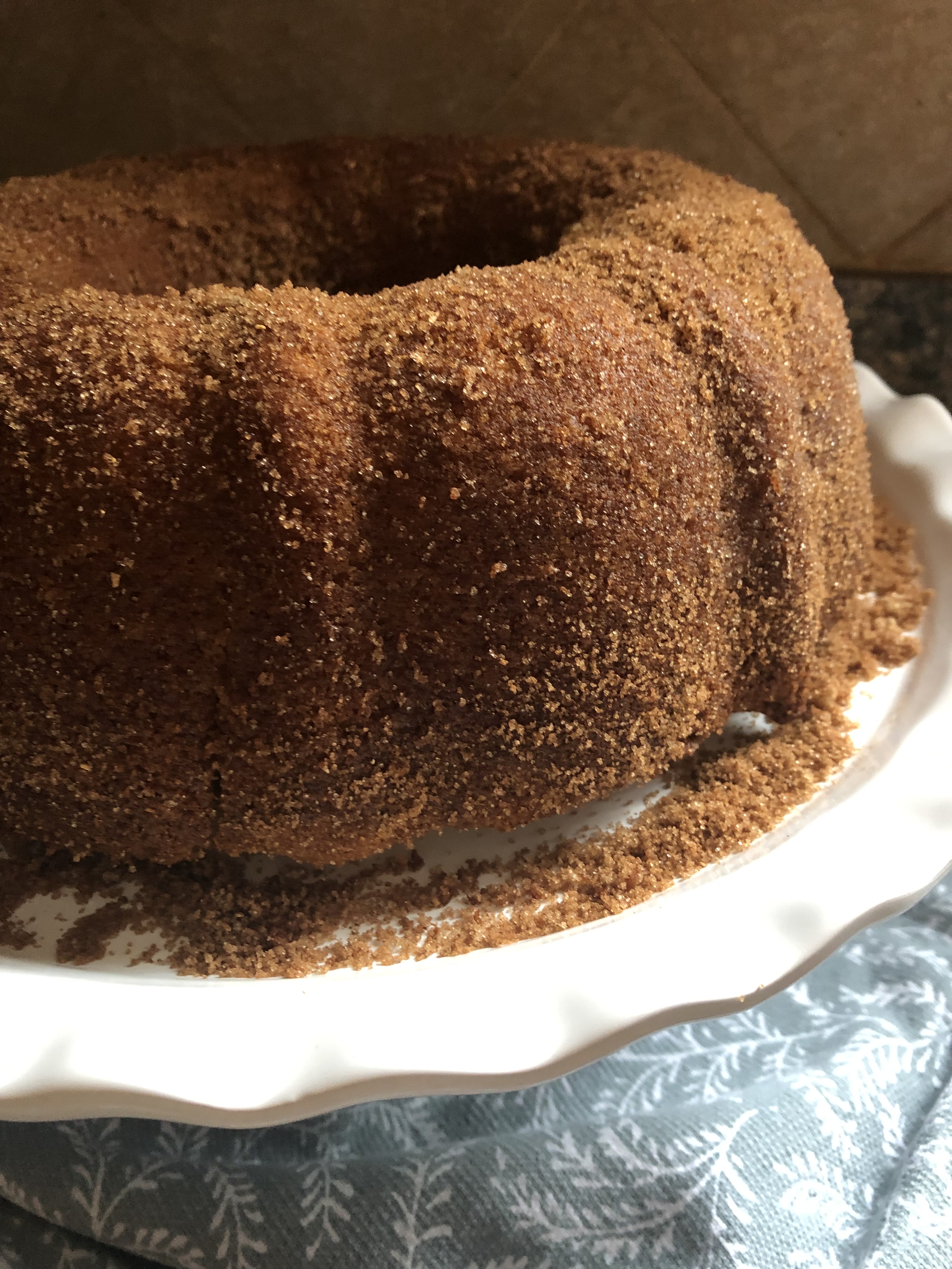 Place the pan on a wire rack and allow the cake to cool completely. Invert the cake on a platter or cake board and rub the remaining cinnamon sugar around it.