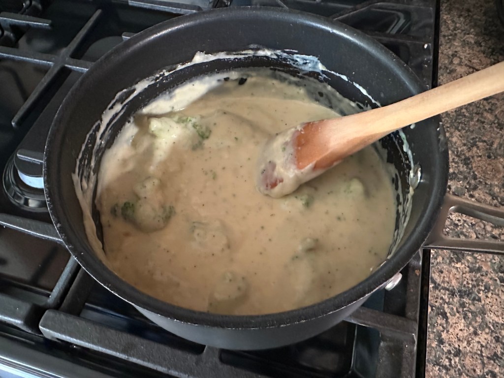 Add the broccoli and cook until heated through. If using frozen broccoli cook until the broccoli is tender and no longer frozen. Remove the pan from the heat and stir in the cheese until melted.