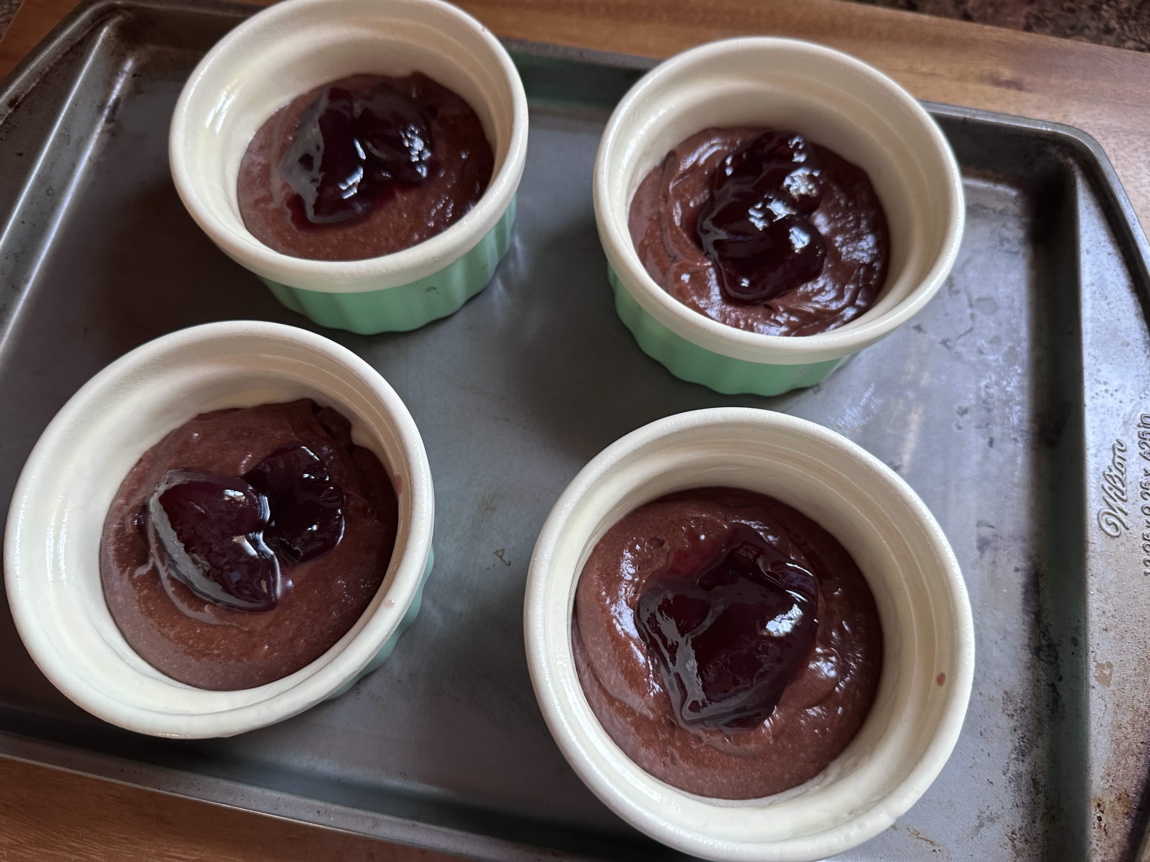 Spoon 1/3 cup of batter into each of the prepared ramekins. Top each with 2 teaspoons of raspberry jam and then top with the remaining batter – 1/4 cup in each.
