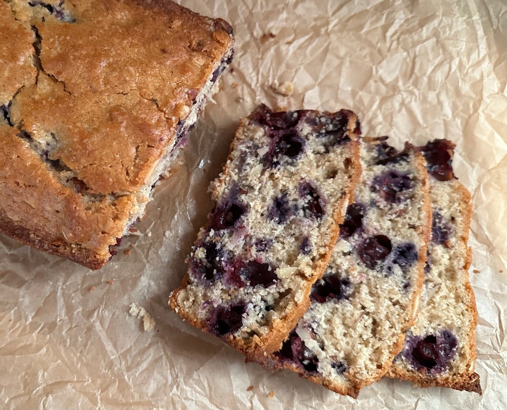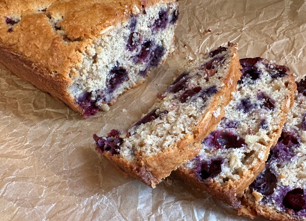 One of the best things I found about making this quick bread, a Blueberry-Almond Quick Bread that is, is that I didn’t have to break out my hand mixer or pull my stand mixer out from the corner of my kitchen counter. I simply used one whisk to whisk together the dry ingredients in one bowl and the wet ingredients in another and then used a rubber spatula to fold everything together. It doesn’t get easier than that.