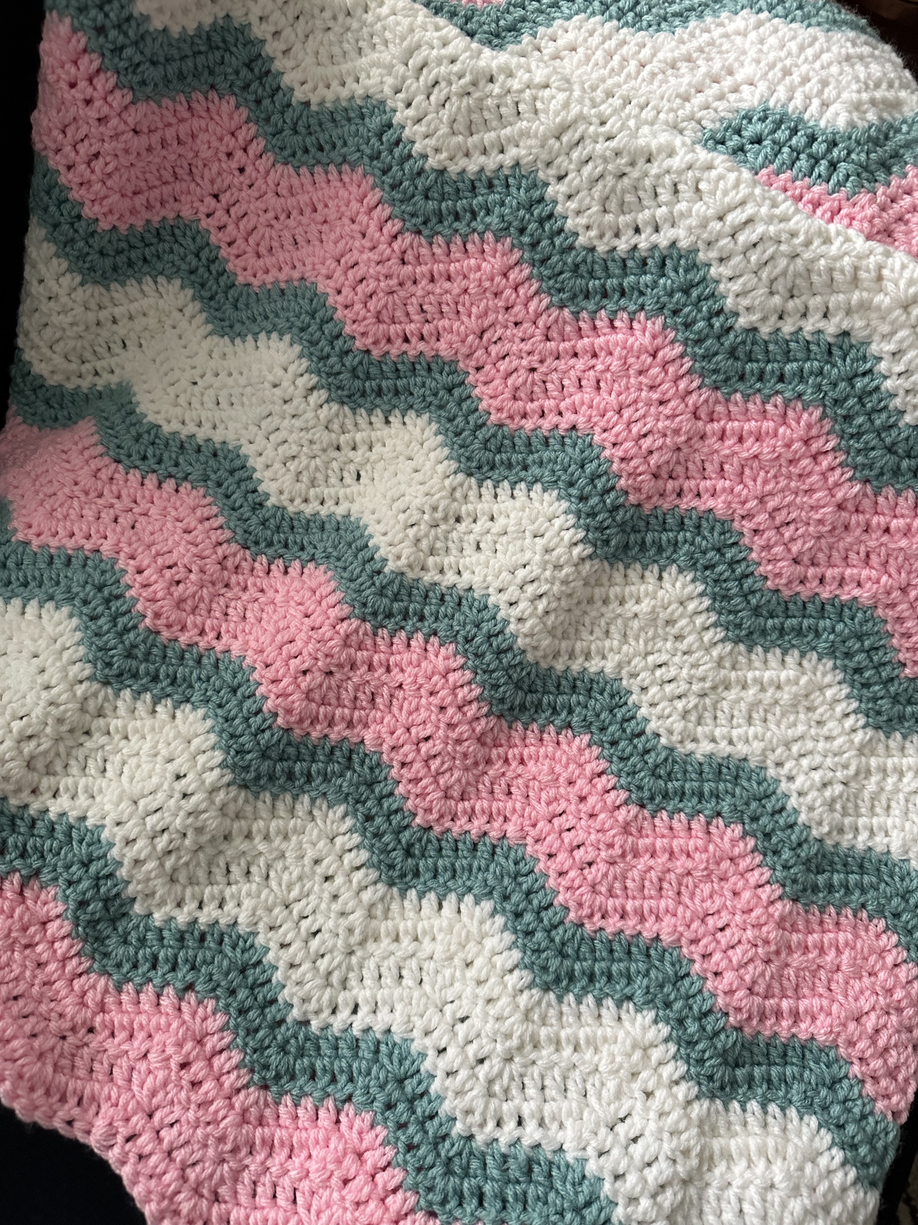 I recently finished a baby blanket in a ripple stitch pattern. While I normally like to use white as the accent/separator color the person requesting this blanket asked that I use green instead. While I initially had my doubts about how it would look, I ended up really liking the variation.