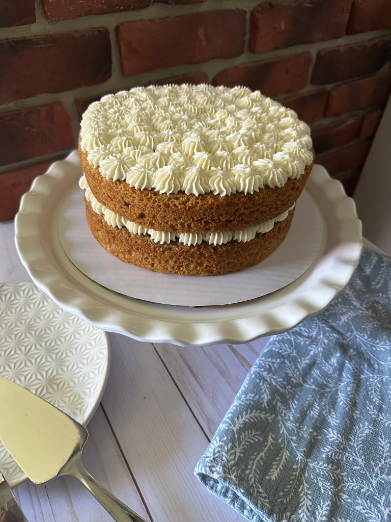 For today’s French Vanilla Espresso Cake with Almond Mascarpone Frosting, I used a French Vanilla boxed cake and instead of adding water to the mix I added in a cup of espresso which toned down the flavor of the French vanilla and gave it a hint of coffee flavor. While the cake is incredibly soft and moist the real stand-out is the frosting. It’s incredibly light and fluffy and the almond flavor is delish without being overpowering. While I opted to pipe stars on the two layers of the cake to decorate it you could also lightly frost it for a naked look.