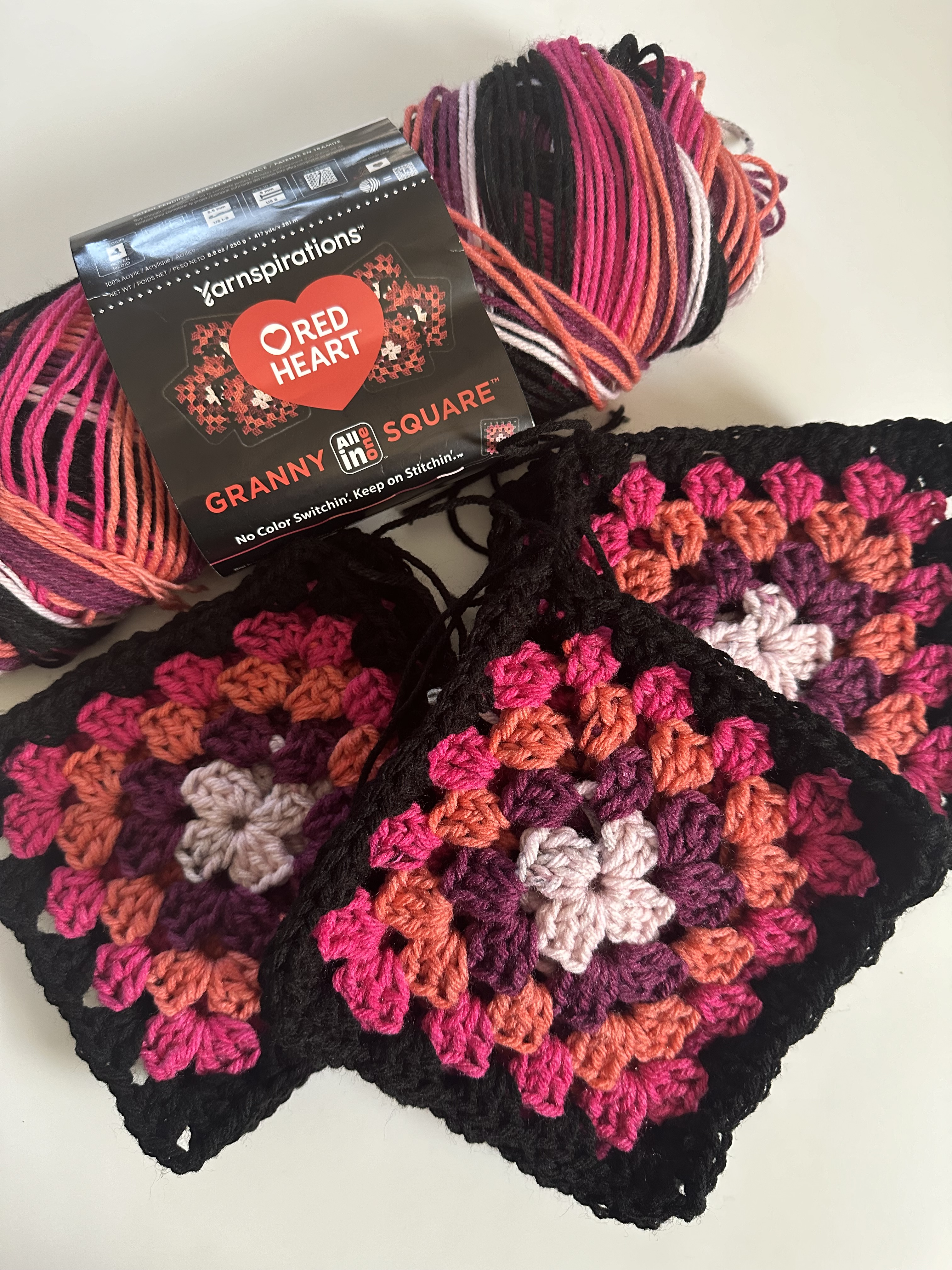 So, I was excited when I saw that Red Heart created a yarn that would minimize ends with granny squares with their new Red Heart All in One Granny Square Yarn. The yarn also takes the guesswork out of selecting colors for the granny squares, although I wasn’t all that thrilled with the color selections. I did find one that I liked, I just had to get my eyes used to crocheting with black yarn. There is a funny saying that goes “If someone makes you something out of yarn, they like you. If they make it out of black yarn, they love you.” Not sure who said it, but there is a lot of truth in it. My mom used to crochet, and she would avoid dark colors (if possible) when working on a project. Working with darker colors requires ample lighting to reduce the strain on your eyes as you work so you don’t miss any stitches. Which can slow your progress down as well. For me personally I can crochet much quicker (and with less mistakes) when working with lighter colors.