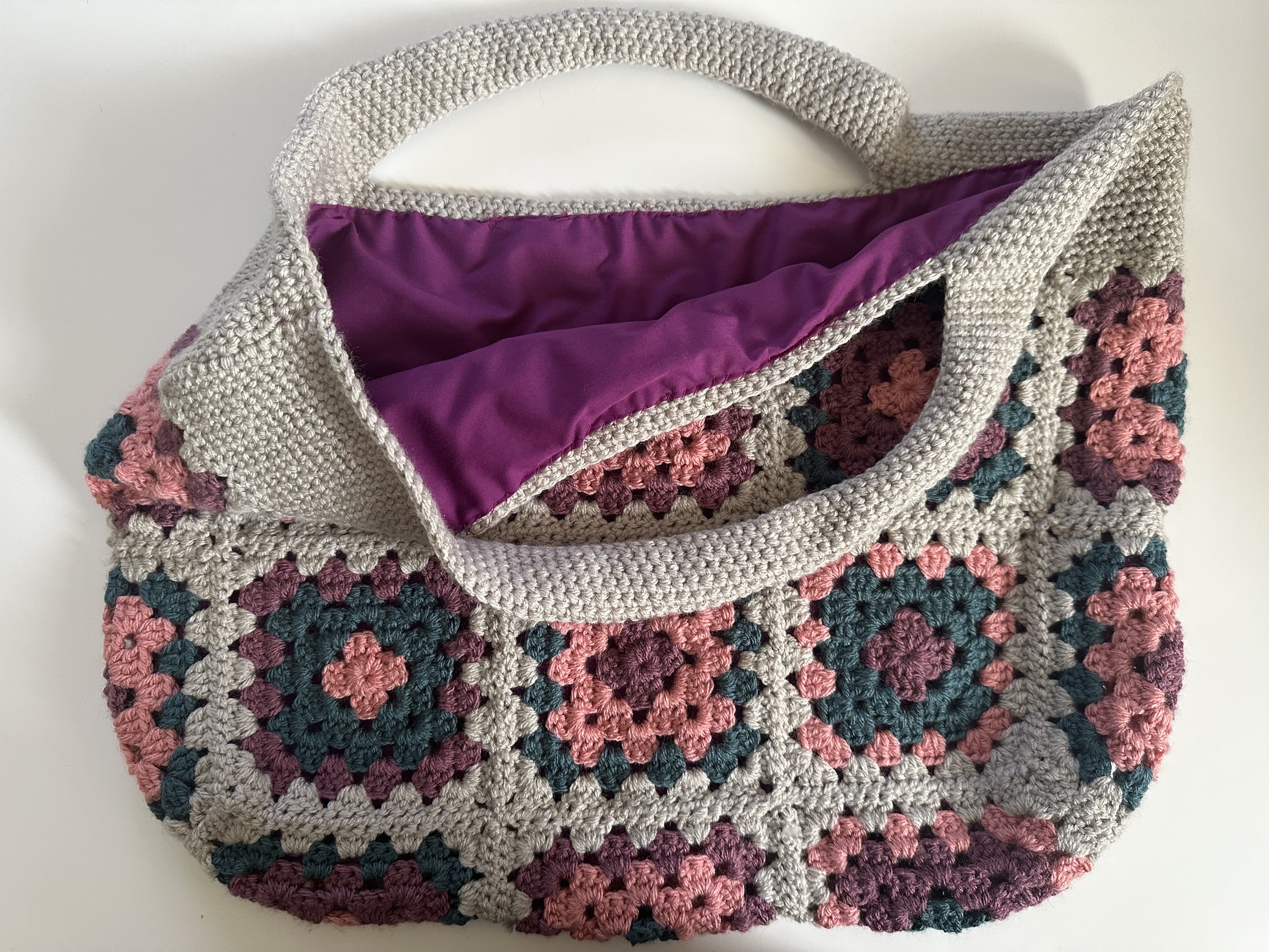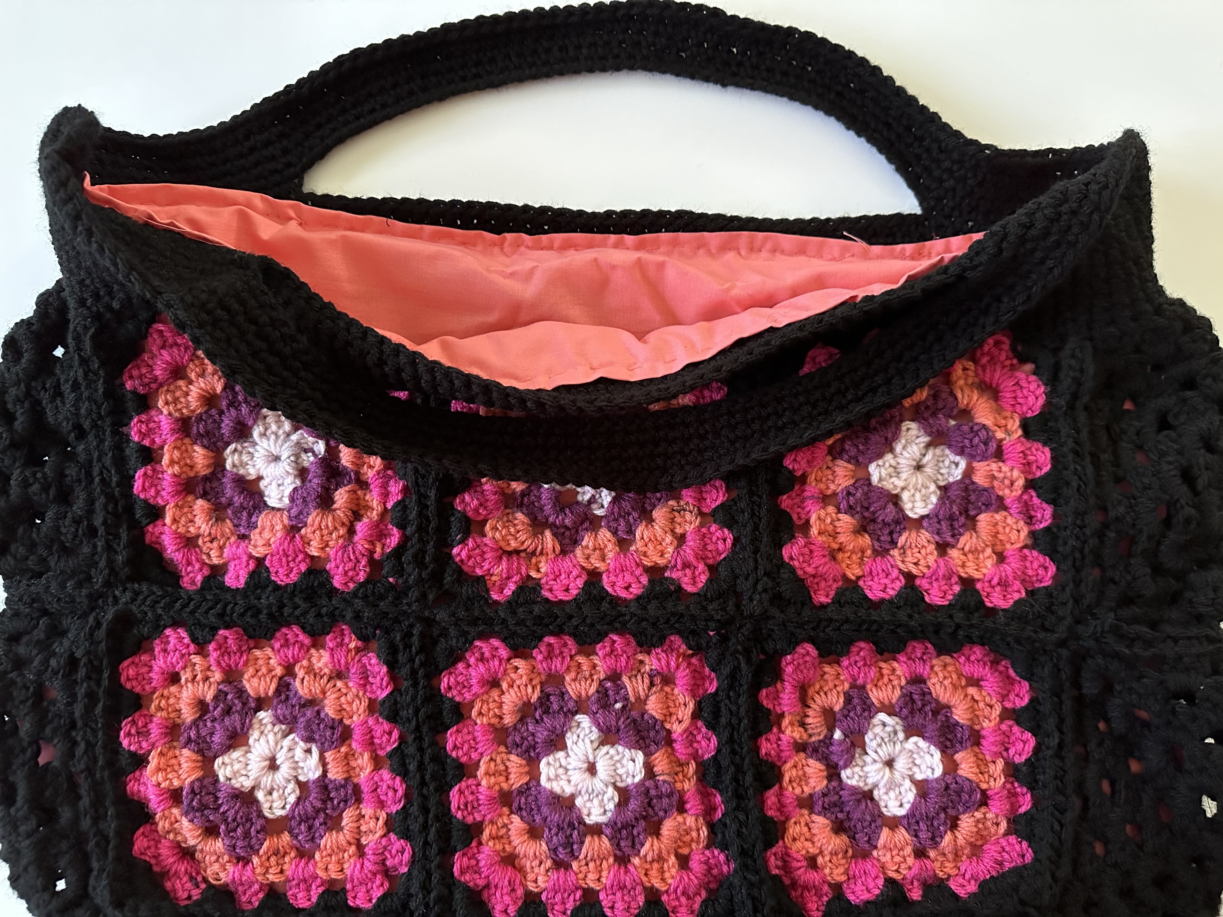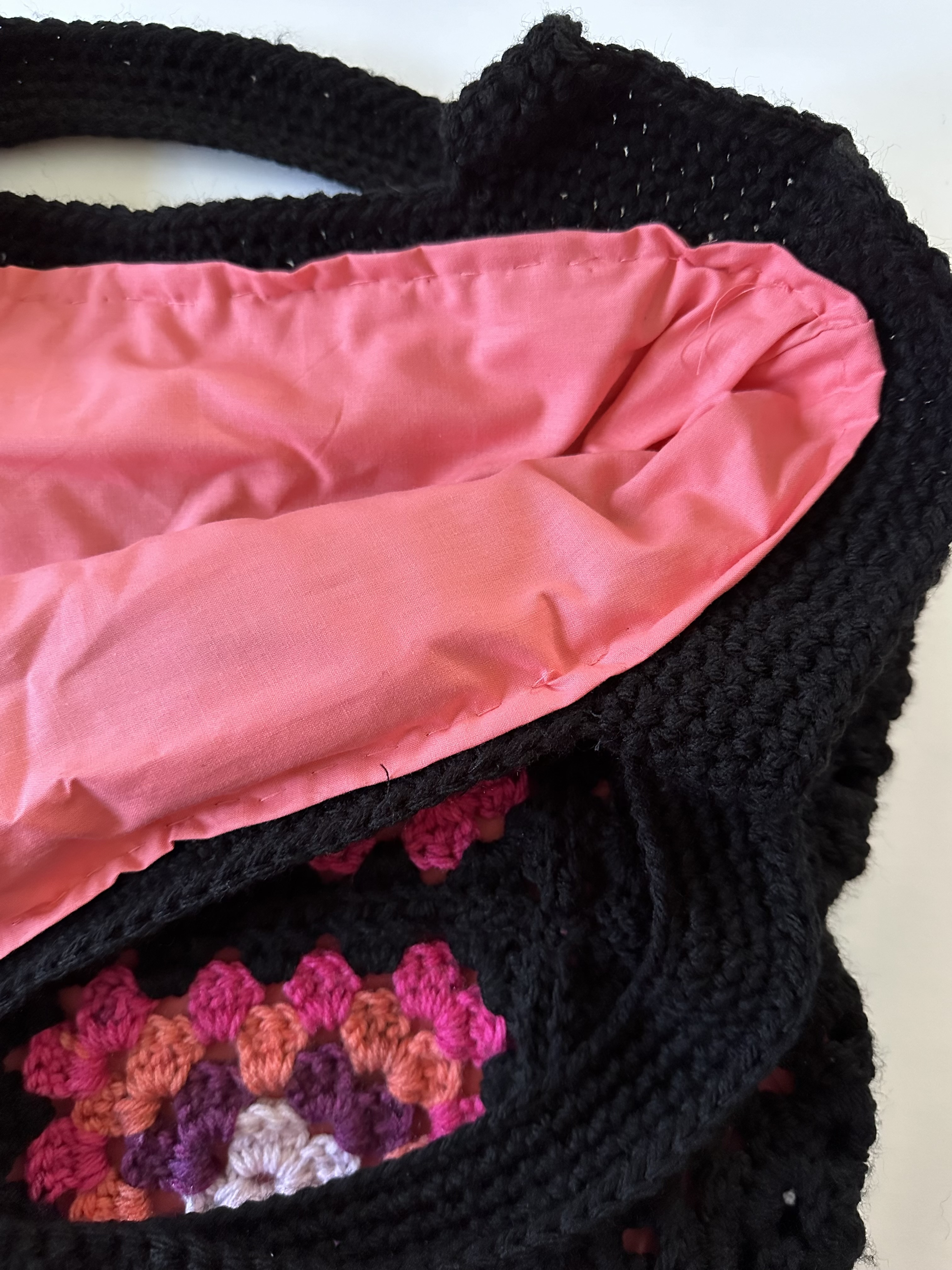 As I mentioned this tote bag was my second granny square bag. After crocheting and stitching together the squares for the first one I decided to add a liner to the bag to give it more structure and to prevent it from stretching when carrying anything in it. This was a daunting task. While I own a sewing machine, I had no clue how to use it for the longest time. I tried once and it was a complete failure. So, to add the liner to the bag I did it completely by hand. Overall, it didn’t come out too bad, but it’s definitely not stitched into the bag completely straight.