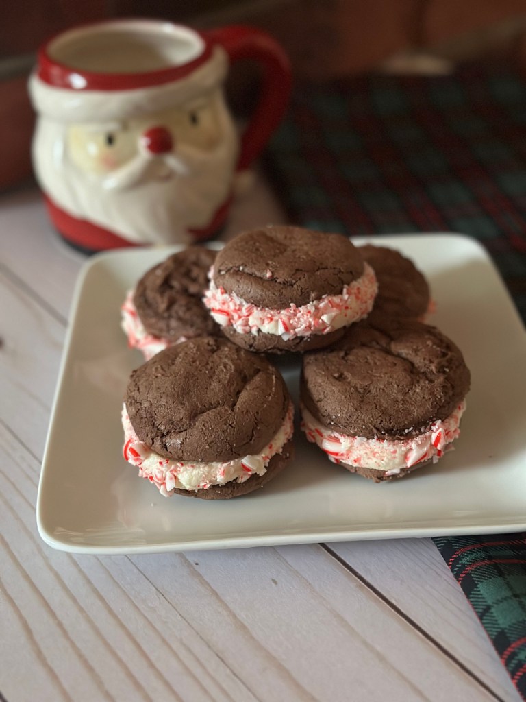 I’m closing out this week of cookies with the quintessential flavor of the season, peppermint! Specifically, a peppermint buttercream sandwich between two chocolate cake mix cookies. Yes, I made the cookies using a cake mix. I’ve shared quite a few cake mix cookie recipes over the years and they’ve always been a success. This recipe is perfect for anyone short on time or just doesn’t want to be measuring flour, baking soda/powder, sugar, etc. One thing to note, the recipe only makes 12 sandwich cookies, as using the cake mix only yields 24 cookies. If you would like more cookies – 24 for example – simply double the cookie recipe – use 2 boxes of chocolate cake mix, 2/3 cup of oil and 4 eggs. The recipe for the peppermint buttercream is enough for the double batch. If you don’t want any left-over filling simply cut the ingredients in half for the buttercream. Here’s an idea though, if you plan on making the Stacked Christmas Confetti Cookies I shared yesterday you could use the leftover buttercream to decorate those. If you don’t feel like tinting the frosting to make the Christmas Tree or Santa Hat, you could pipe a snowflake instead.