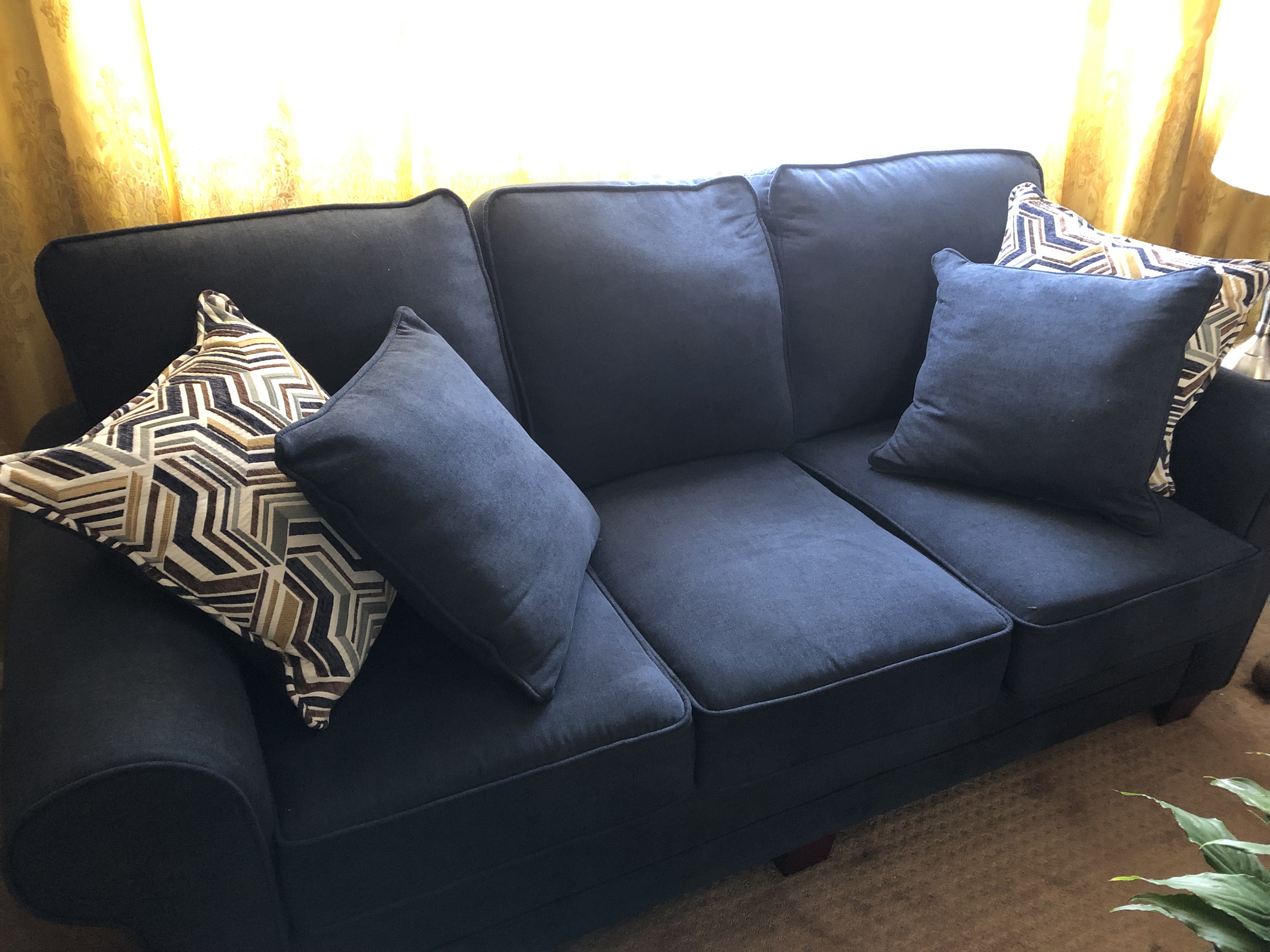 The one piece I held on to was the curved middle piece. For two reasons, Lucky, my dog, liked to go under the sofa and I still needed a place for people to sit when they came over. Granted it was a small piece, but, it was something. I had visions in my mind of what I wanted the remodeled living room to look like. I was thinking light aqua walls, whitewashing the accent brick wall, hardwood floors and some patterned curtains. Oh, and I had a vision of a grey couch with studding. I stuck up color swatches on the wall to get ideas for the right shade of aqua and I ordered curtain swatches to match them to my chosen wall color. And then recently something changed. We spend a lot time living our lives with a vision of a future that may or may never come. We think to ourselves, oh, when this happens then I’ll do x y and z. But, what if that thing never happens. What if we never meet the right person, never get our dream job and desired salary, or whatever else it is that we are waiting for? Are we supposed to give up on the dreams we hope would follow? Absolutely not. We should find a way to make anything and everything happen that will make us happy. So, there I was waiting for the perfect salary to have enough money to do everything I wanted all at once. But, I realized that what I wanted was to be able to sit in my living room now and watch television, read a book, crochet/knit, etc. So, I decided I would buy a new sofa, nothing expensive. But, something to hold me over until I could get what I really wanted. I decided on my favorite color, navy blue.