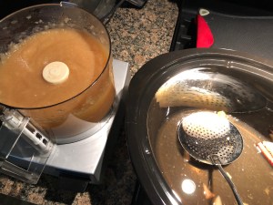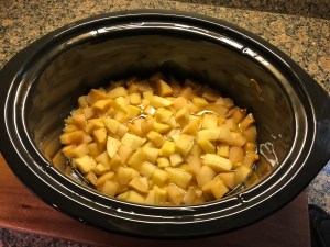 Next, I combined brown sugar, spices and chopped walnuts with softened butter and divided the mixture among the apples which I placed in a glass baking dish. And finally, before placing the apples in the oven I filled the bottom of the dish with a cup of boiling water. This helps to keep the apples moist while baking.