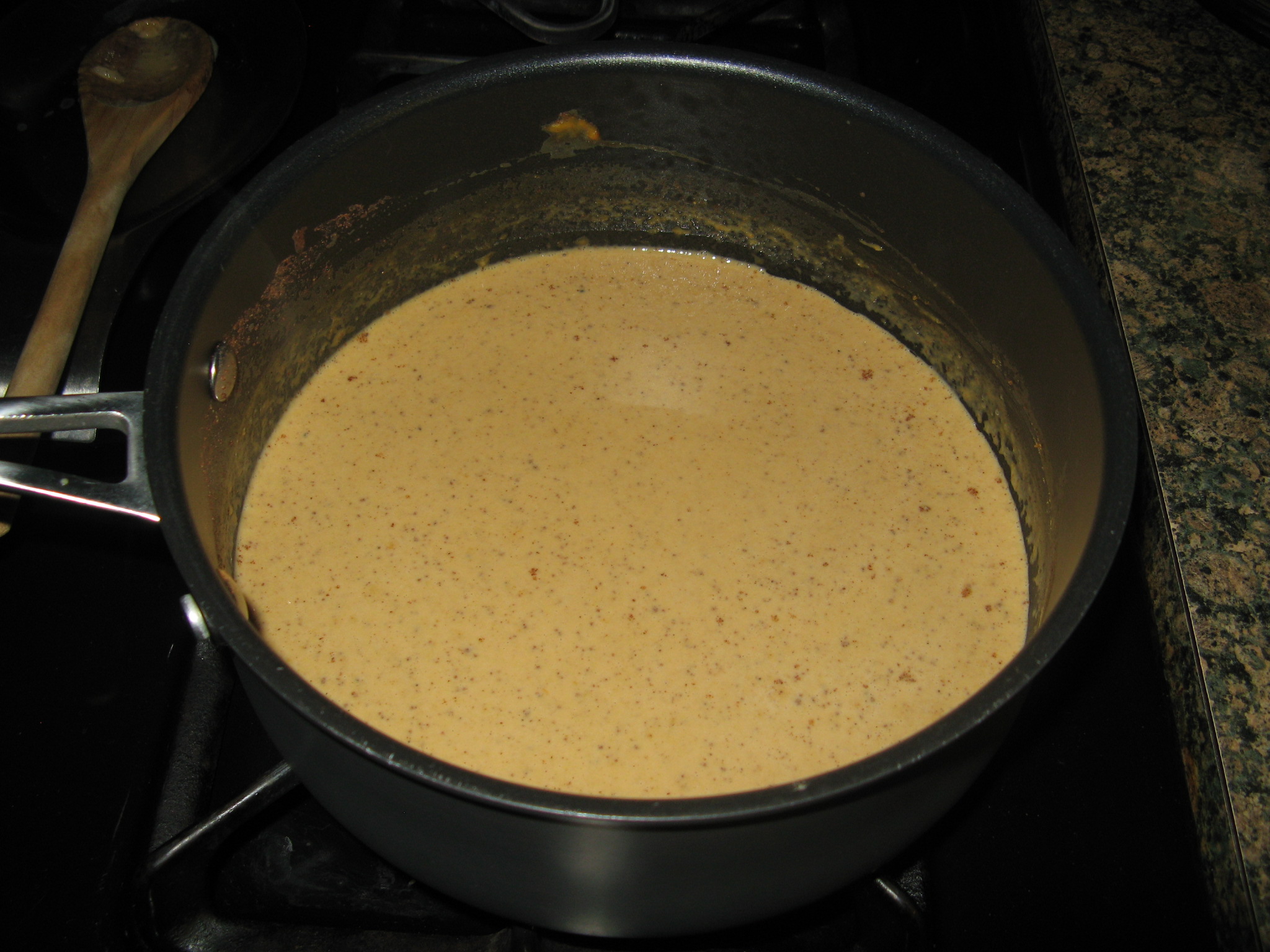 In another saucepan I combined evaporated milk, pumpkin, dark brown sugar, pumpkin pie spice and vanilla extract and brought it to a simmer.