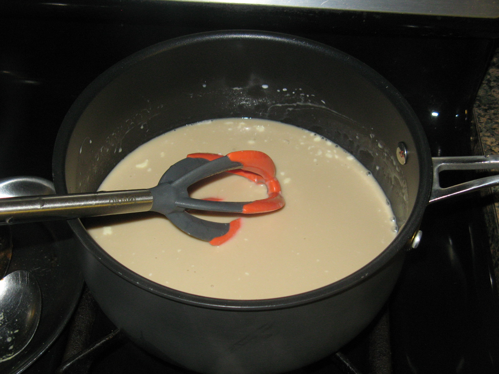 In a small saucepan I combined whole milk, heavy cream, salt, granulated sugar, and dark brown sugar and brought it to a simmer over medium heat whisking it to dissolve the sugars.
