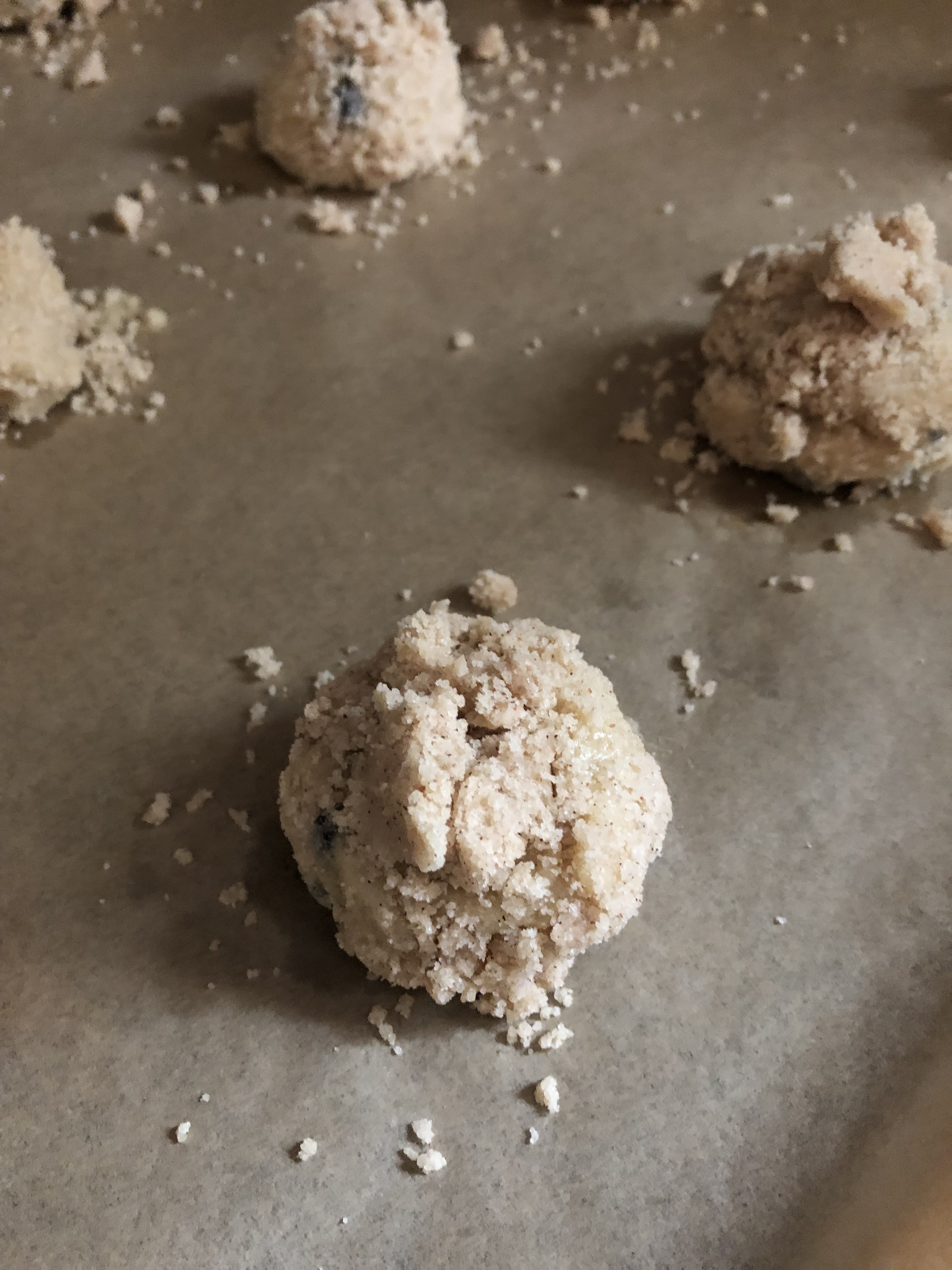 Once both were ready, I rolled scoops of the dough in the crumb topping and then placed it on my baking sheets. And in case you are wondering, no, the crumb topping won’t burn and yes it will stick to the cookie even after baking.