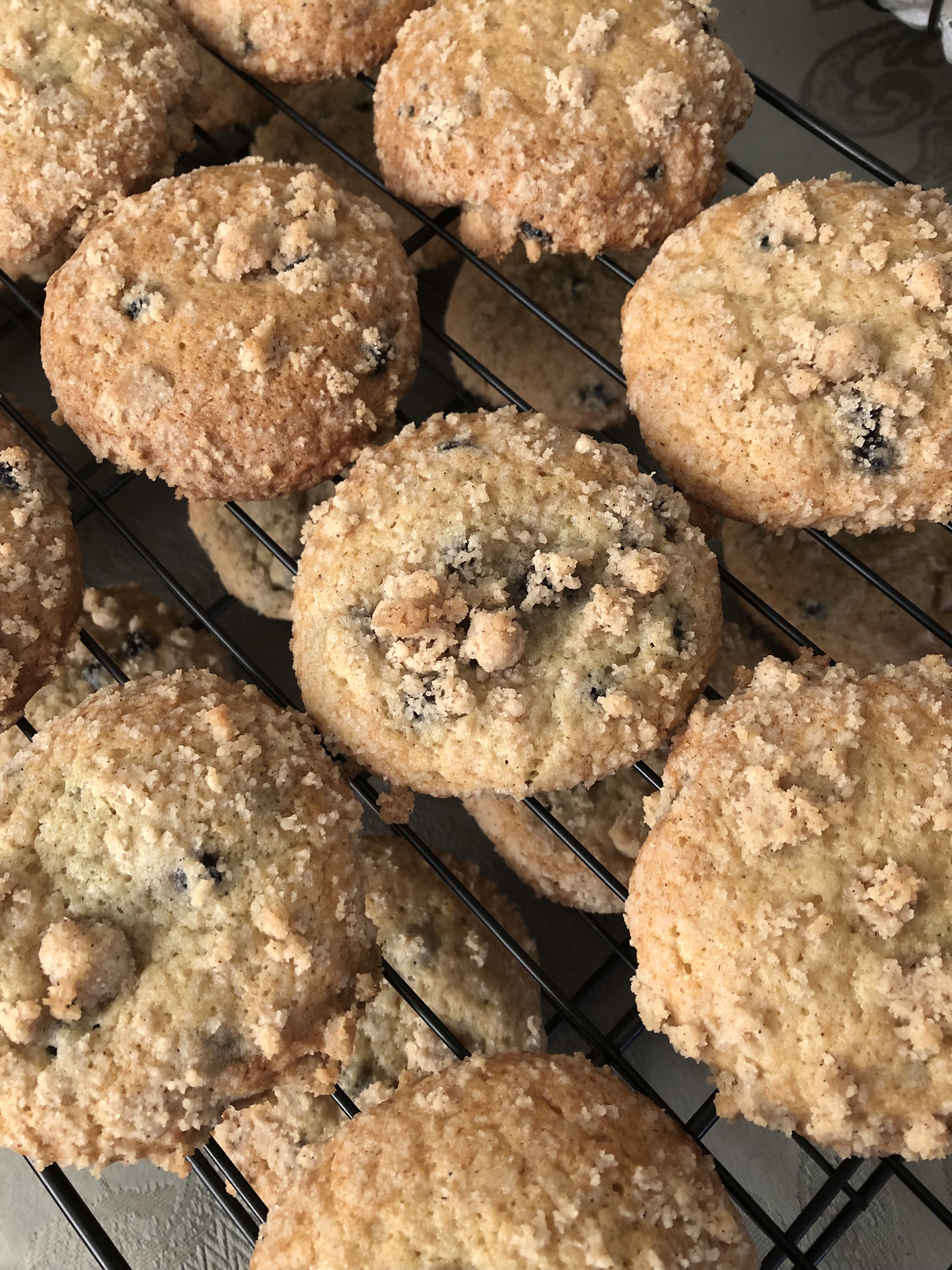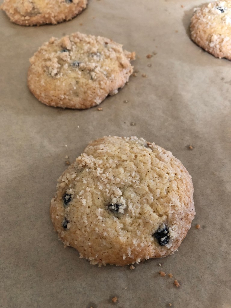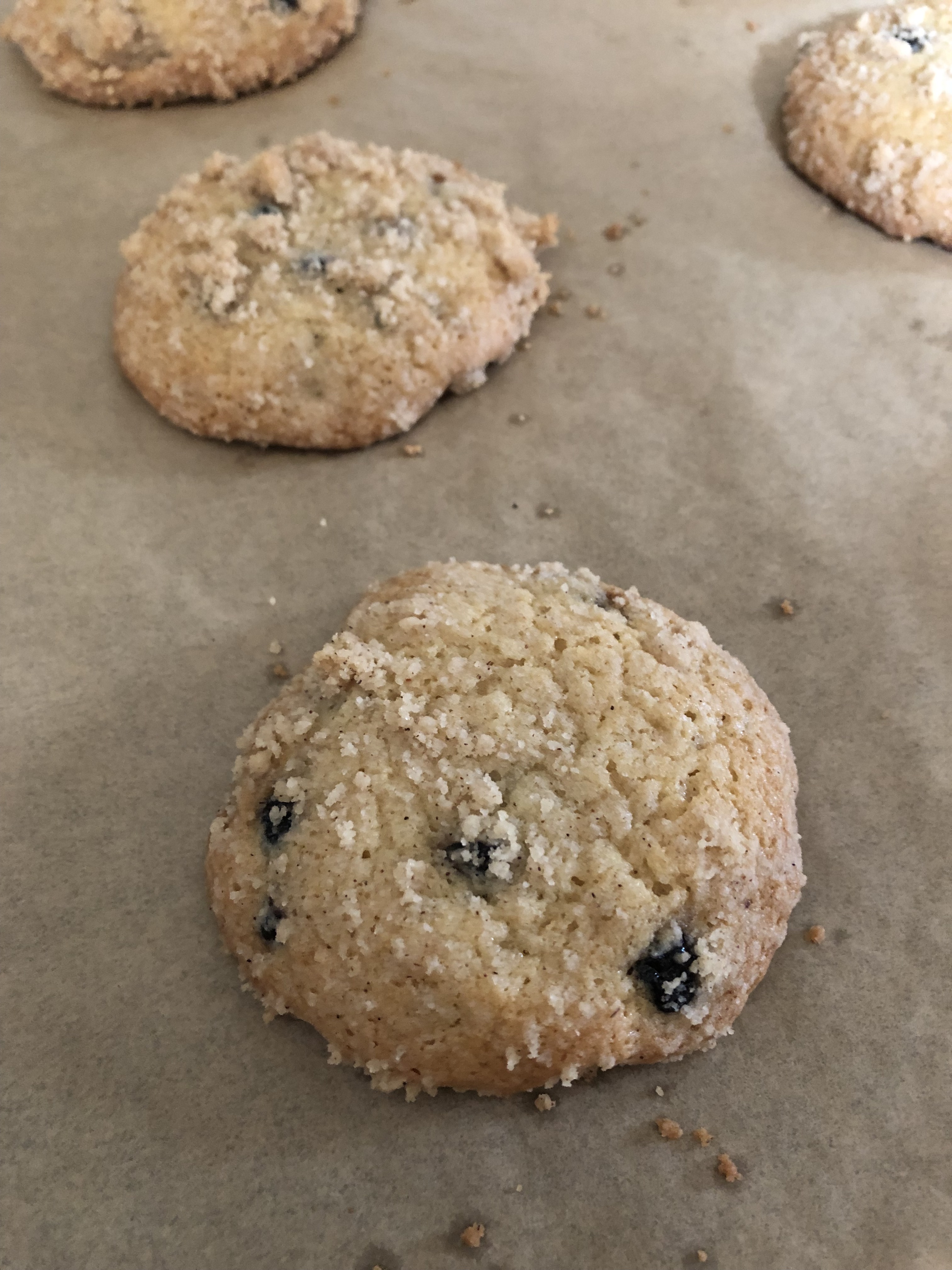 I’ve saved my favorite cookie for last… A Blueberry Crumb Cookie. I got the idea for this cookie while baking one of my favorite summer desserts, a Blueberry Crumb Cake. Granted you can make it anytime of the year, but it tastes best when the blueberries are at their sweetest. Initially I was thinking of using fresh blueberries in the cookie, but for a few reasons I didn’t think it was the right move. I was concerned that some of the blueberries would be sour (not a good thing for a cookie), inevitably different sizes (you kind of want uniformity in a cookie) and that they might turn the cookies blue during baking. Since cookie dough is a lot thicker than cake batter, I thought that there was good chance of the blueberries being slightly decimated while folding them in. Thankfully I was able to find dried wild blueberries that eliminated all those concerns I had from using fresh ones.