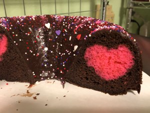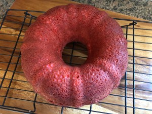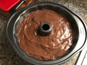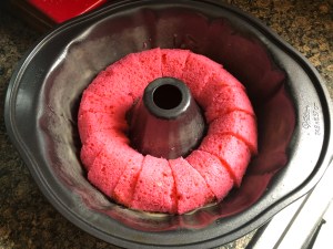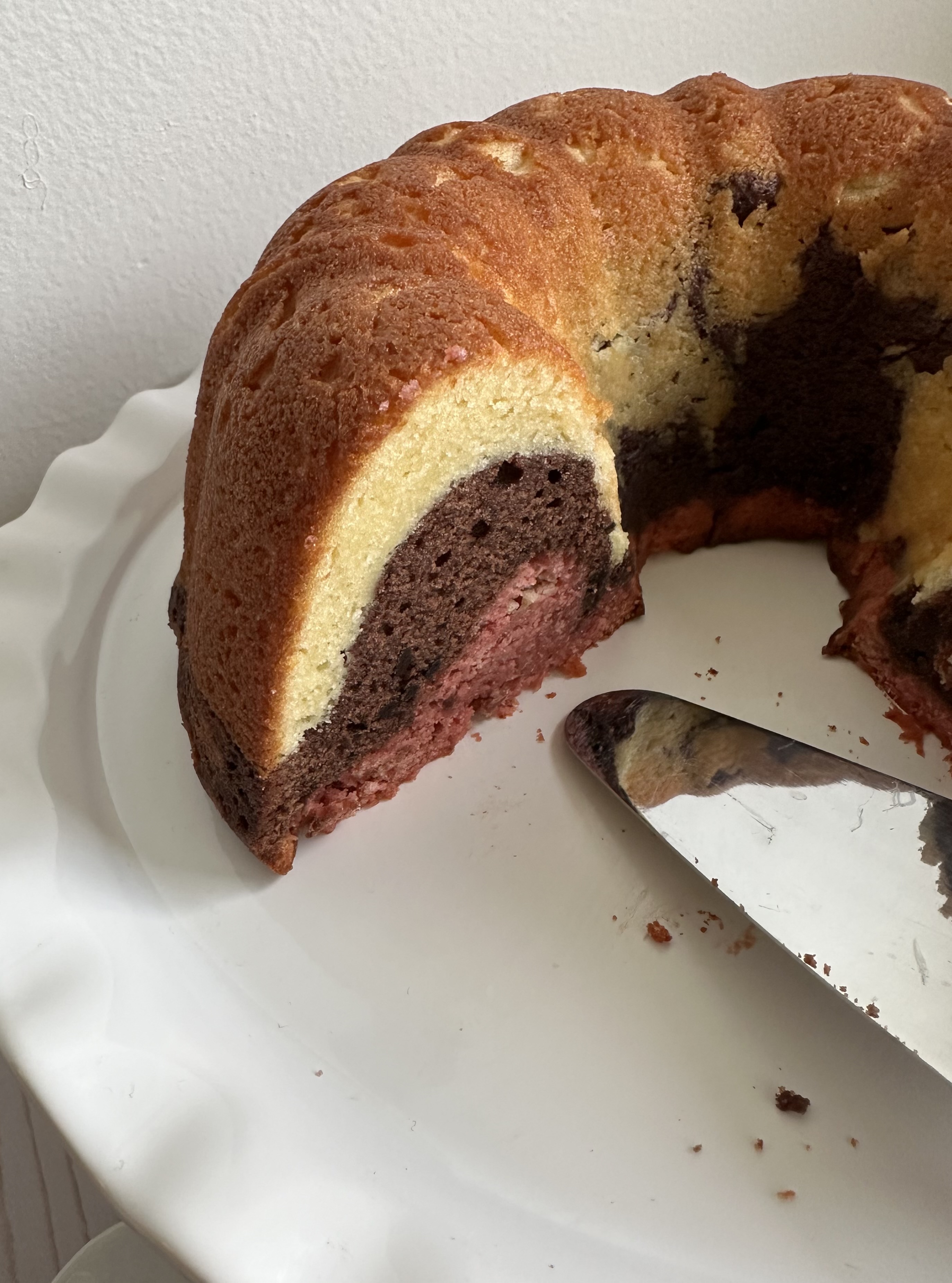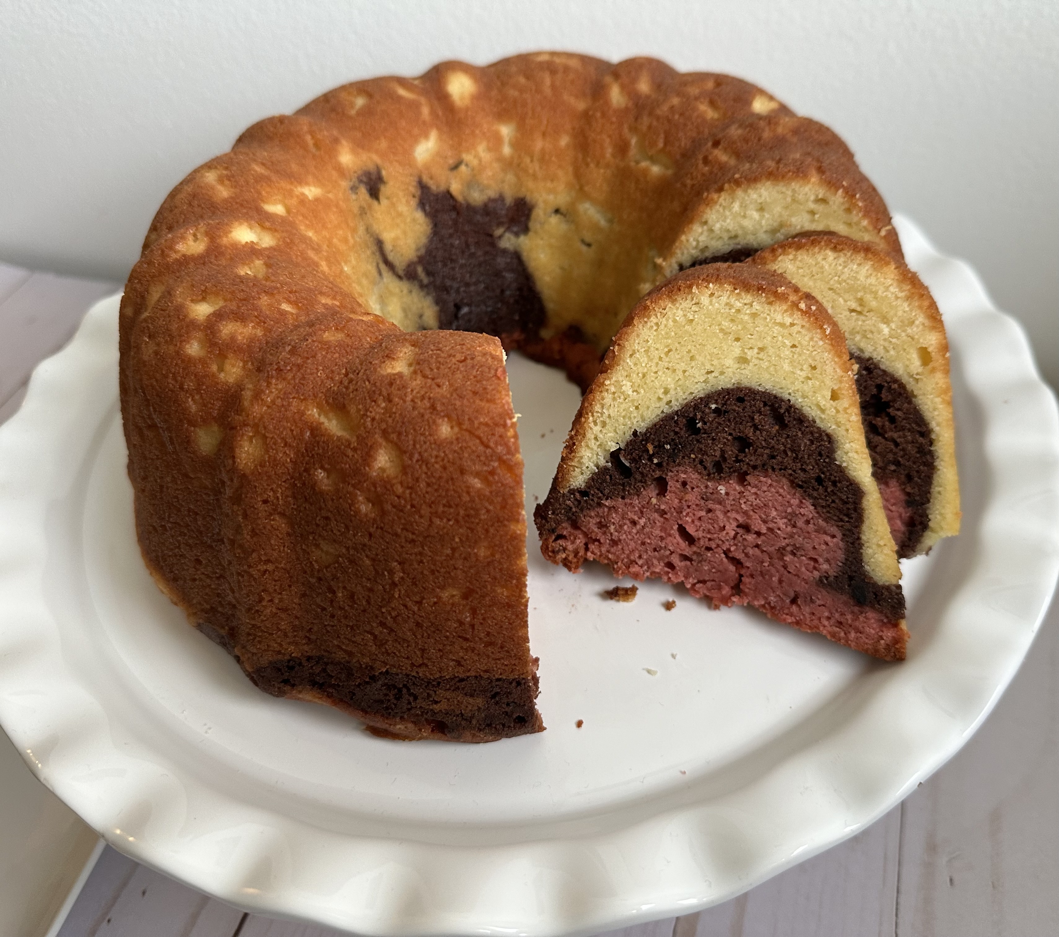 Pour the original (unflavored/vanilla) batter into the prepared Bundt pan. Gently pour the chocolate batter in top and finally the strawberry batter.