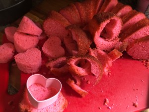 Transfer 2 cups of the batter to a bowl and an additional 2 cups to another bowl. In one add the dried strawberry powder, strawberry emulsion and red food coloring and in the other the cocoa powder. Stir both batters well until well blended.