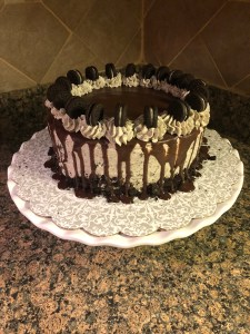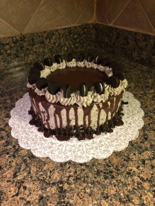 Next, I spread the chocolate frosting over the cupcakes leaving the holes open. I then patted the crumbled pieces of chocolate cake onto the frosting to resemble dirt.