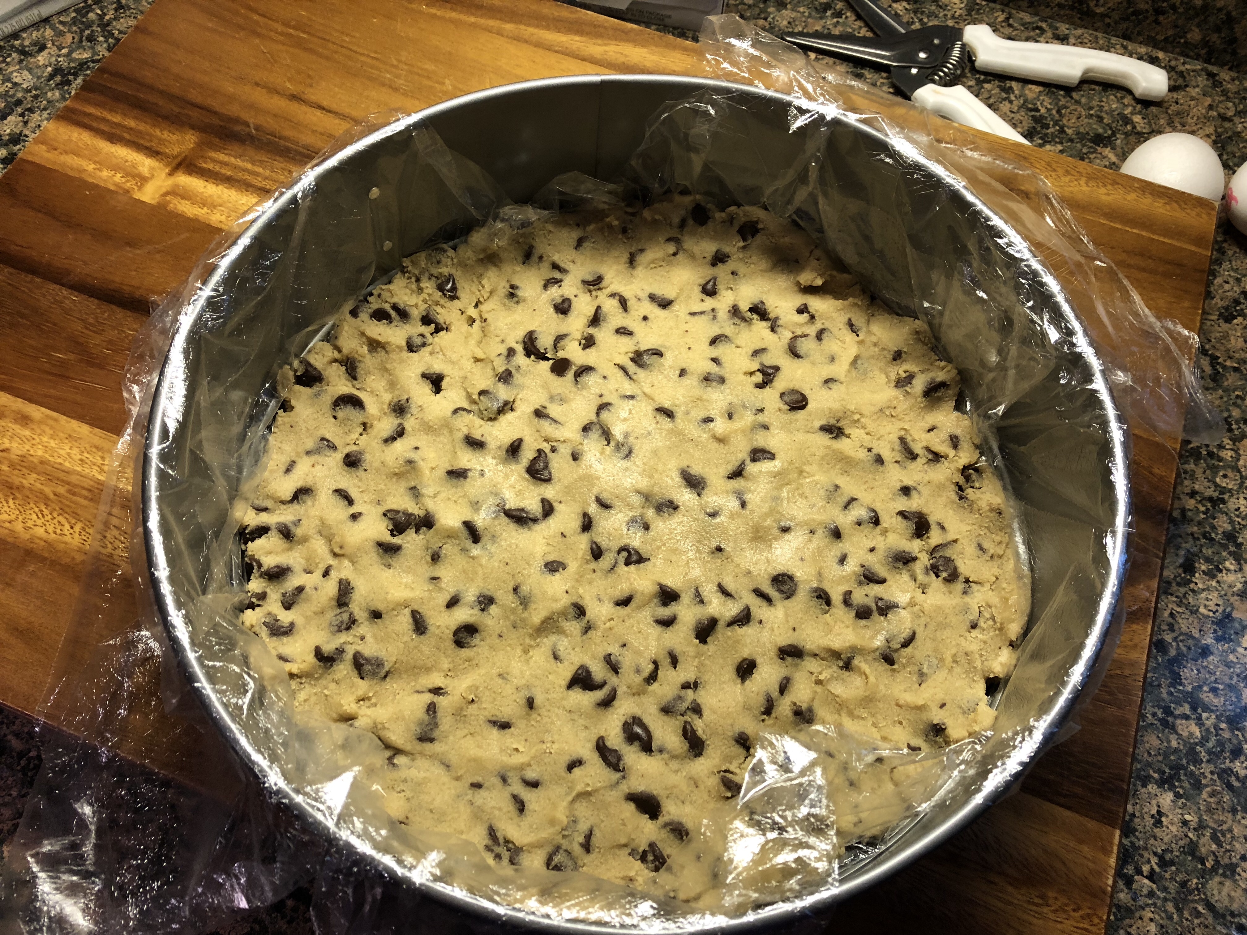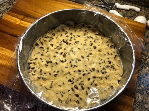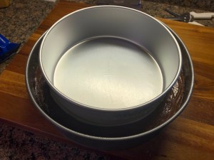 After running a few errands I came back home and got to work on the cake. The plan was a two-tier blue ombre buttercream cake decorated with fresh sunflowers. To save myself time (and stress) I baked the cake layers a few days before, let them cool and then wrapped them in plastic wrap to store in the refrigerator. I started by making my short-cut chocolate mousse and then refrigerated it while I whipped up a batch of vanilla frosting. Once the frosting was done I then torte, filled and crumb coated the two tiers. Each tier was a three-layer cake – chocolate cake sandwiched between two yellow caked. Once 6-inch, the other a 9-inch.